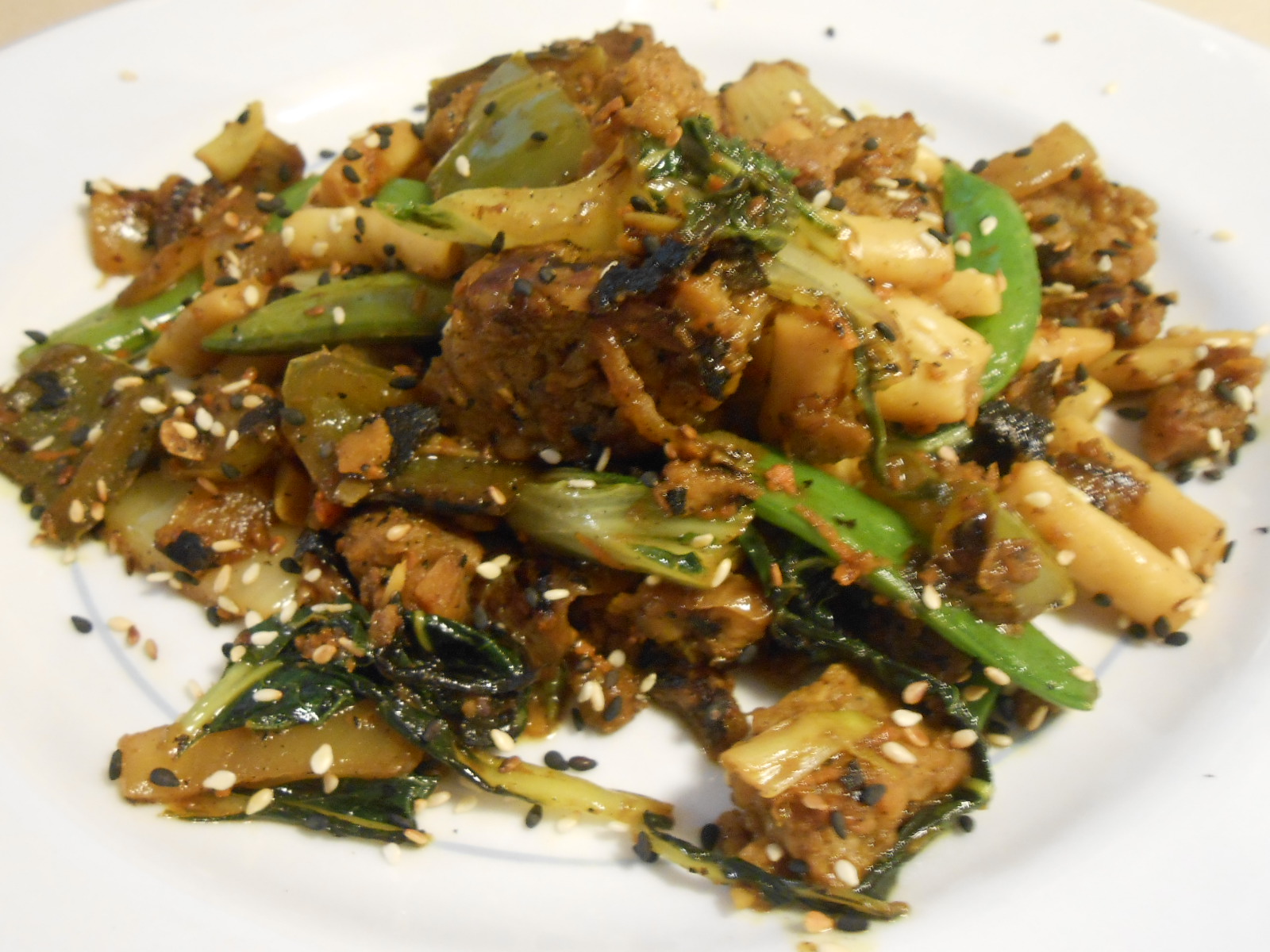 Drizzle 2 T. additional sesame oil over soy sausage, toss, add freshly ground black pepper to taste and continue cooking till browned. Now mix into the veggies in skillet.
