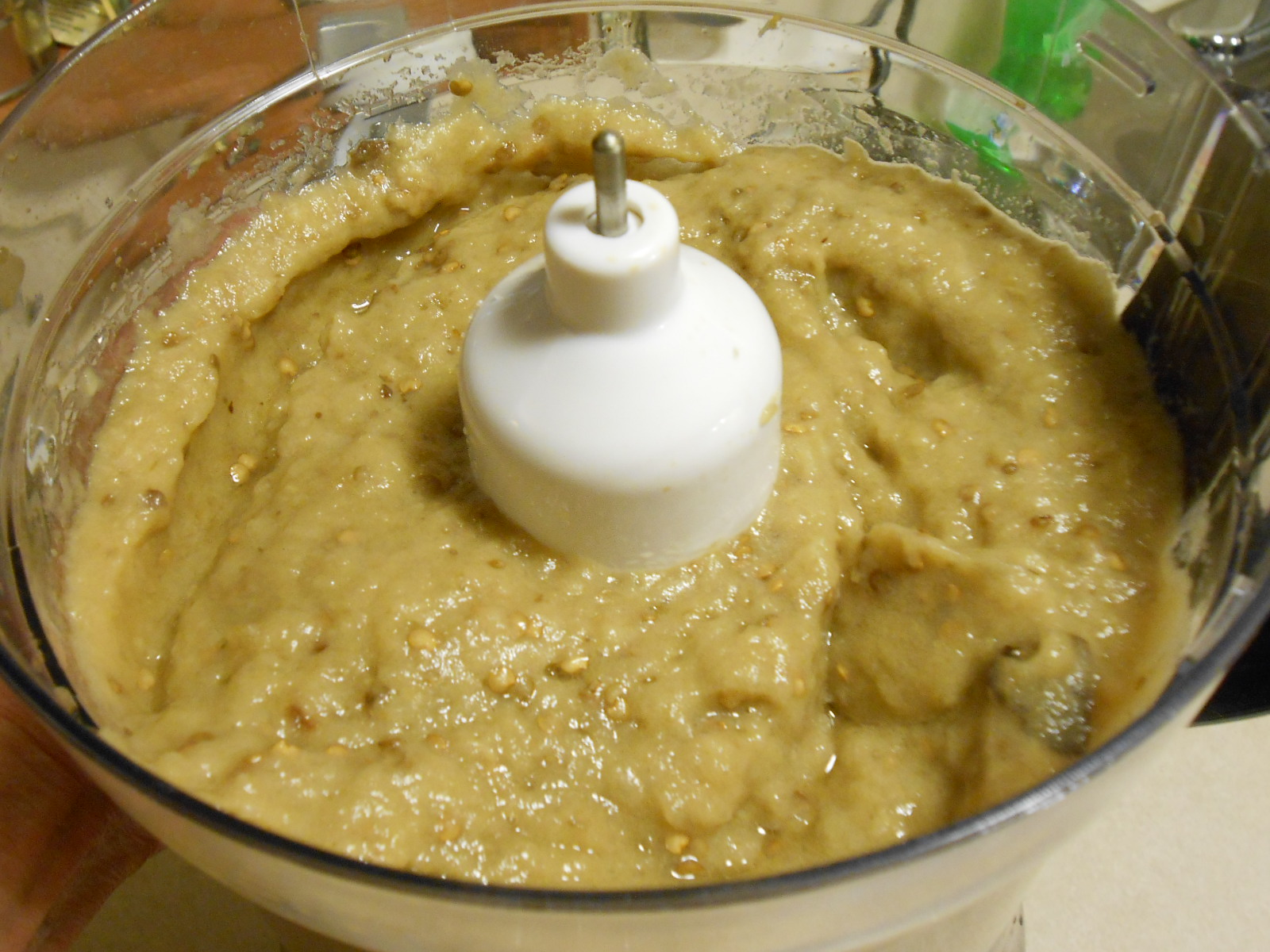 Remove skins from roasted eggplant, placing meats into food processor. Add 2 t. salt, then process till as smooth as you can get it.