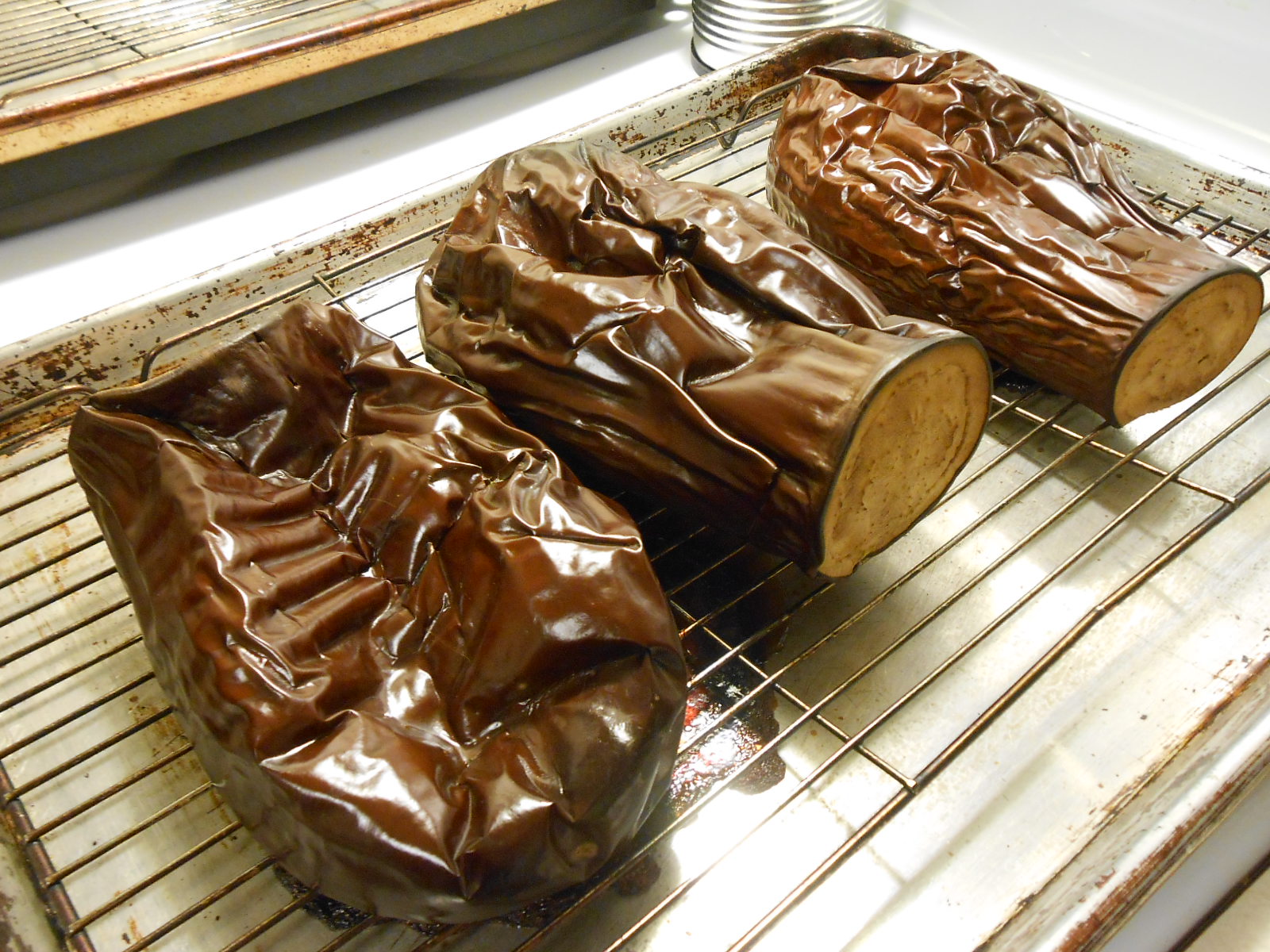 3 ripe eggplant; cut off top, prick with long fork in several places, place on a rack over a baking sheet in 400 degree oven
