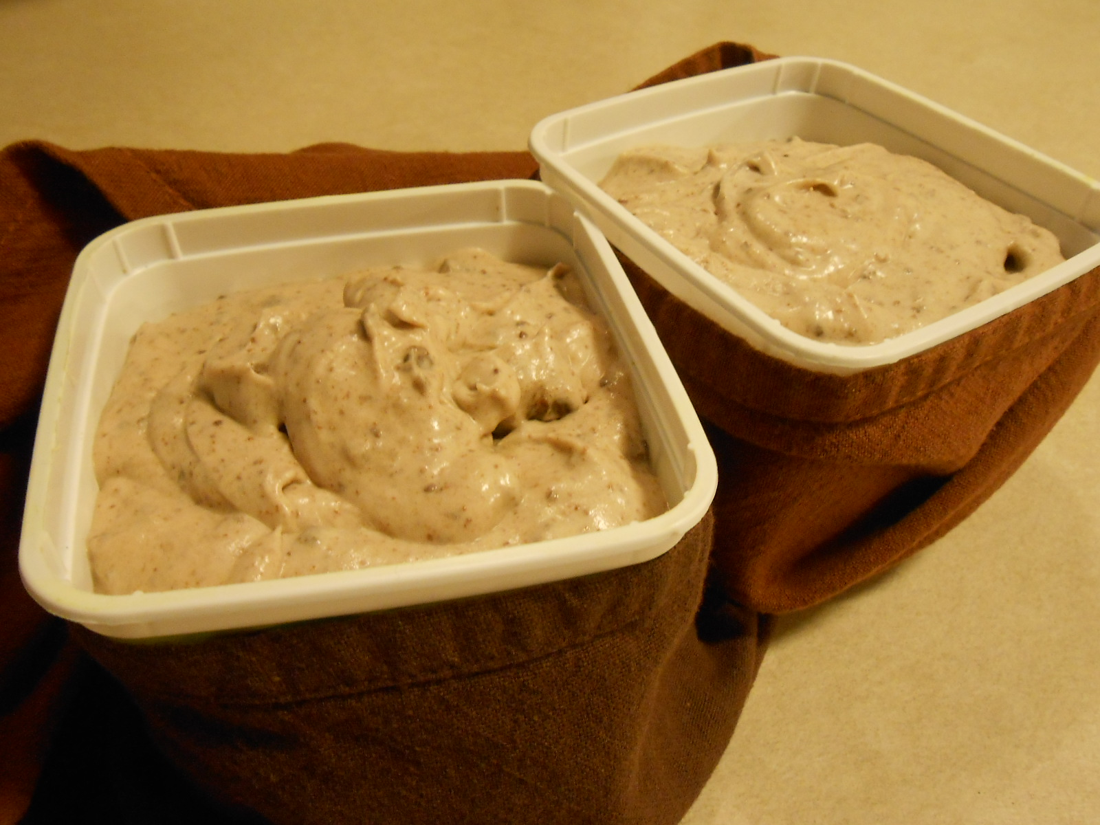 Or, place in covered container that fits the amount of dessert. Wrap the container in a cloth napkin or dish cloth. Place in a gallon size plastic freezer bag, seal and freeze till the dessert reaches the desired consistency you want. The towel and bag keep it from freezing too quickly.