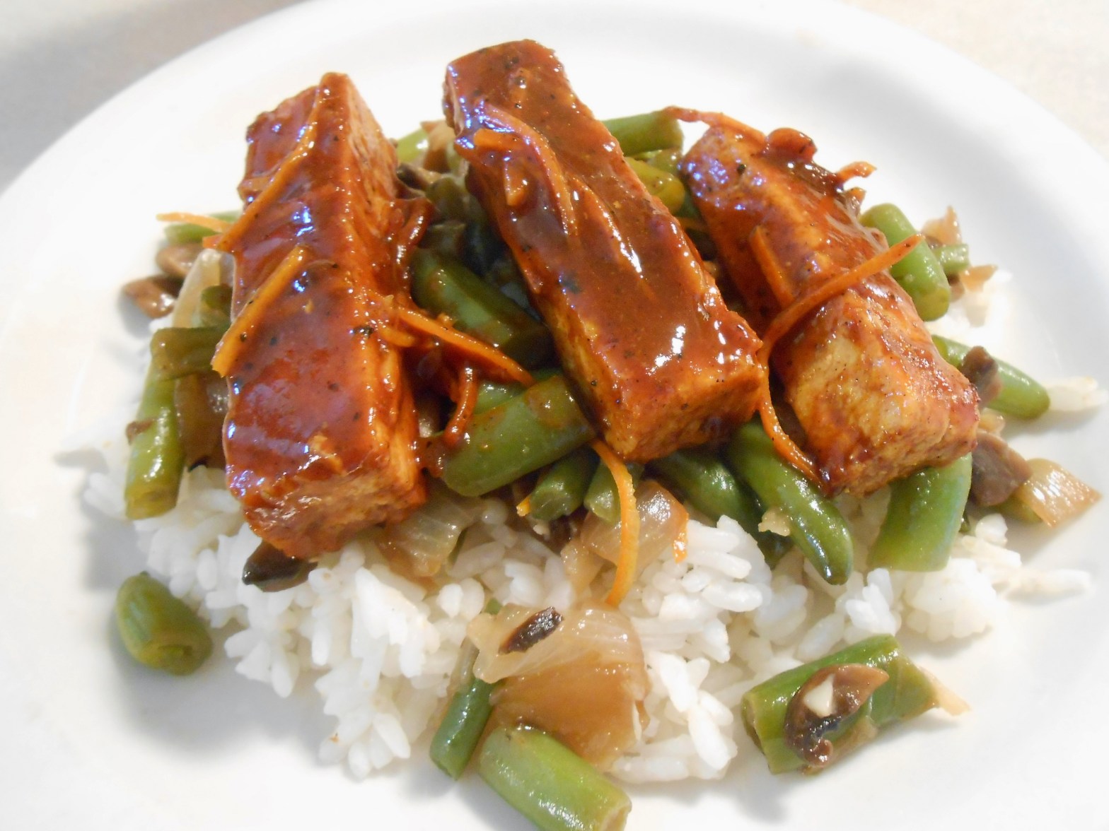 To serve: Place a scoop of rice on each plate. Top the rice with the saute, then lay 3 tofu sticks per serving on top of the saute. Spoon a little sauce over the sticks. Serve.
