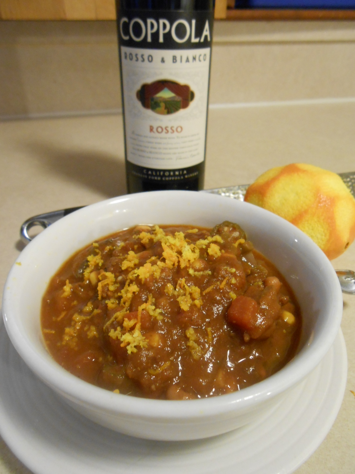 Sauteed peppers, onion and Yves Veggie Ground combined with mushrooms, Bush’s Blackeye Peas, green beans, corn and okra. Simmered in a red wine and coffee tomato herb broth. Thickened with pumpkin! Garnished with orange zest!