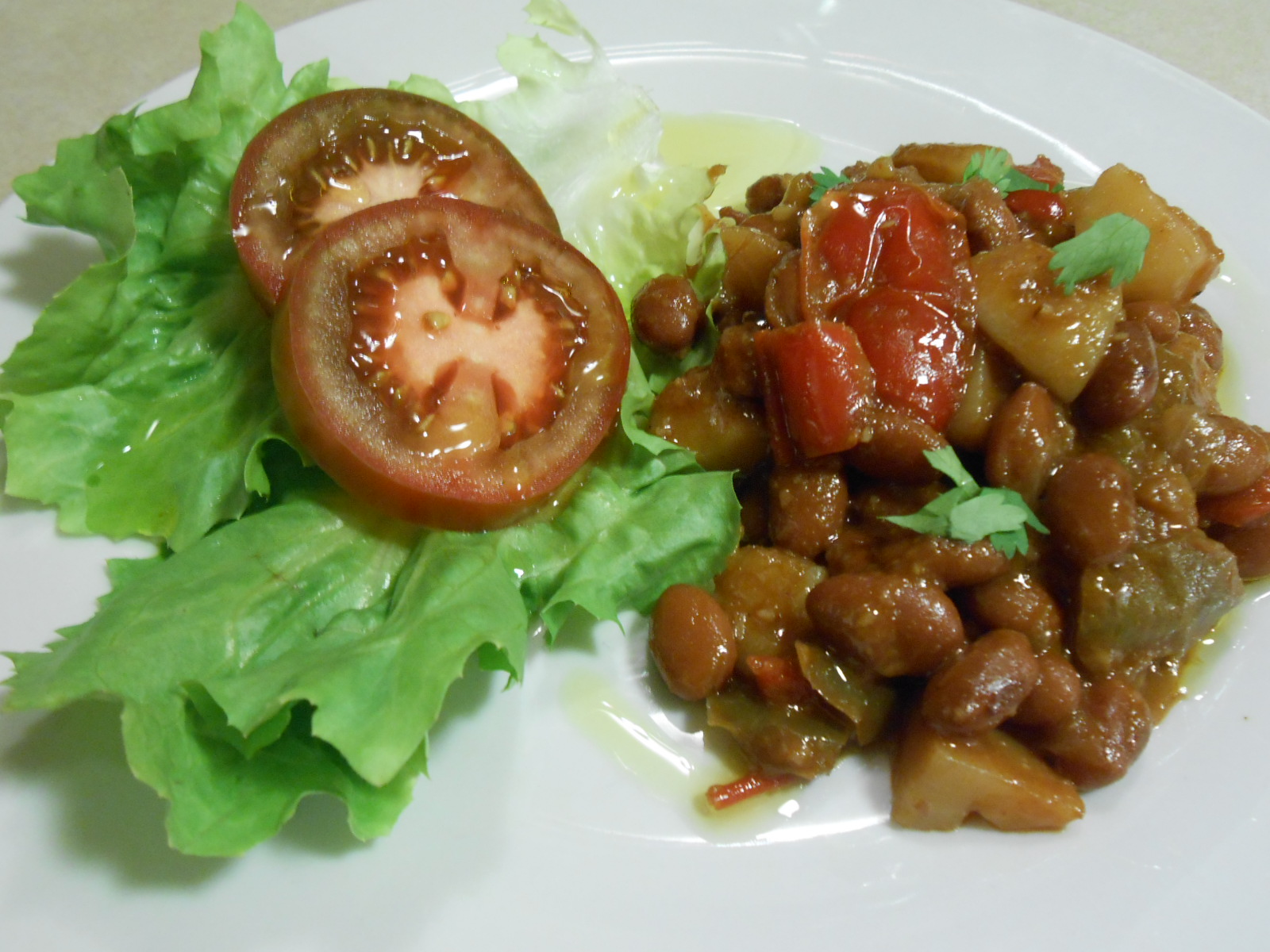Go Max Go vegan candy bars processed with green chilies as a base for this potato and pink bean mole. Sauteed peppers and onion combined with red wine, smoky paprika and thyme, then cooked till fatty and meaty flavors and textures are achieved completes the deal! Served with escarole lettuce and kumatoes drizzled with extra virgin olive oil. Wow!