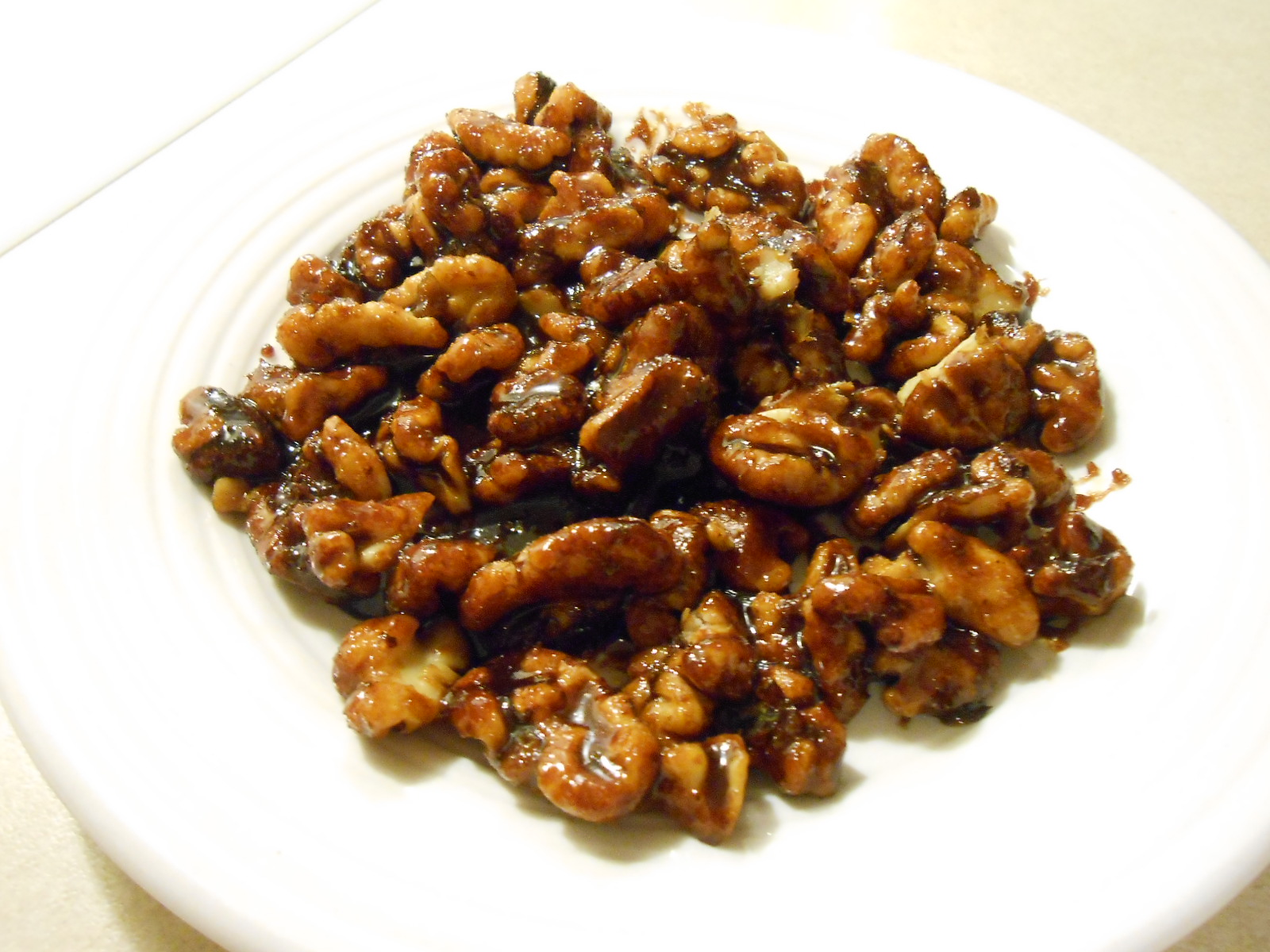 After 15 minutes, stir on plate to separate walnuts, then return to refrigerator till ready to use.