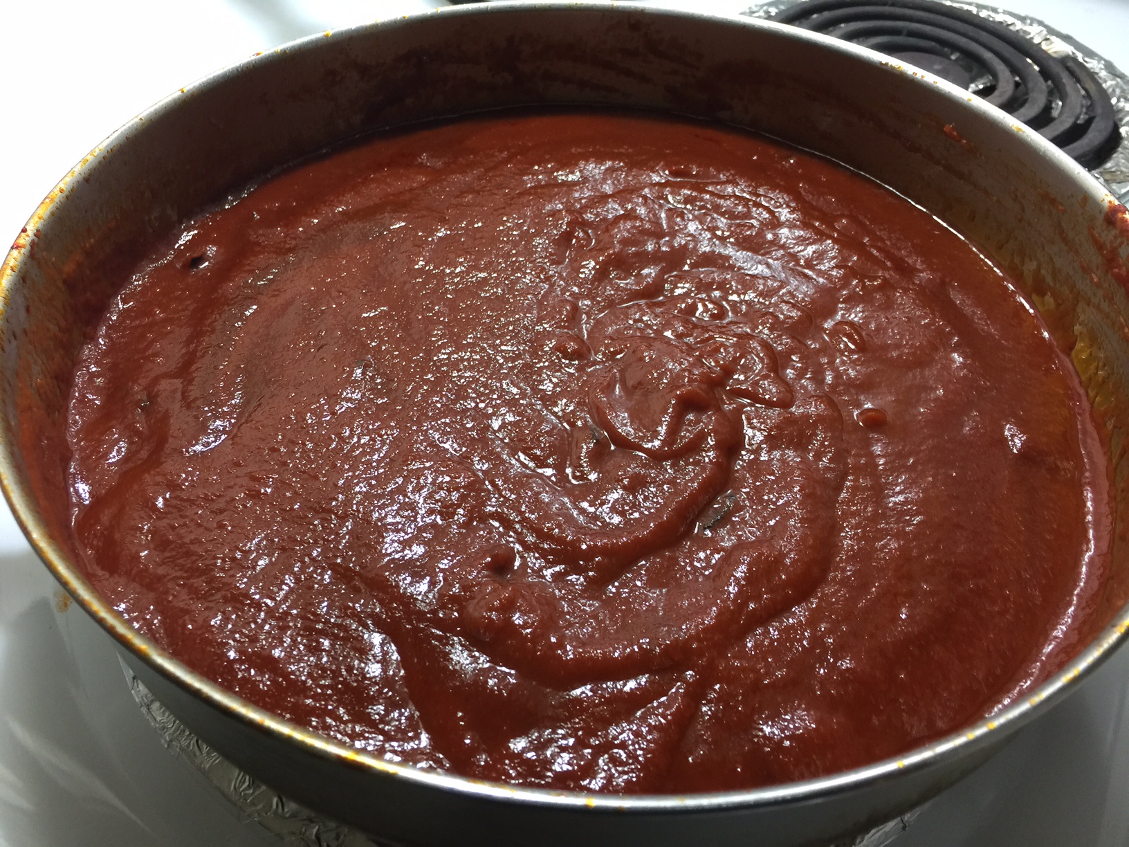 Add an additional 2 T. extra virgin olive oil. Stir well to incorporate, bring to slow boil, reduce heat, partially cover to keep sauce from spitting all over the stove.