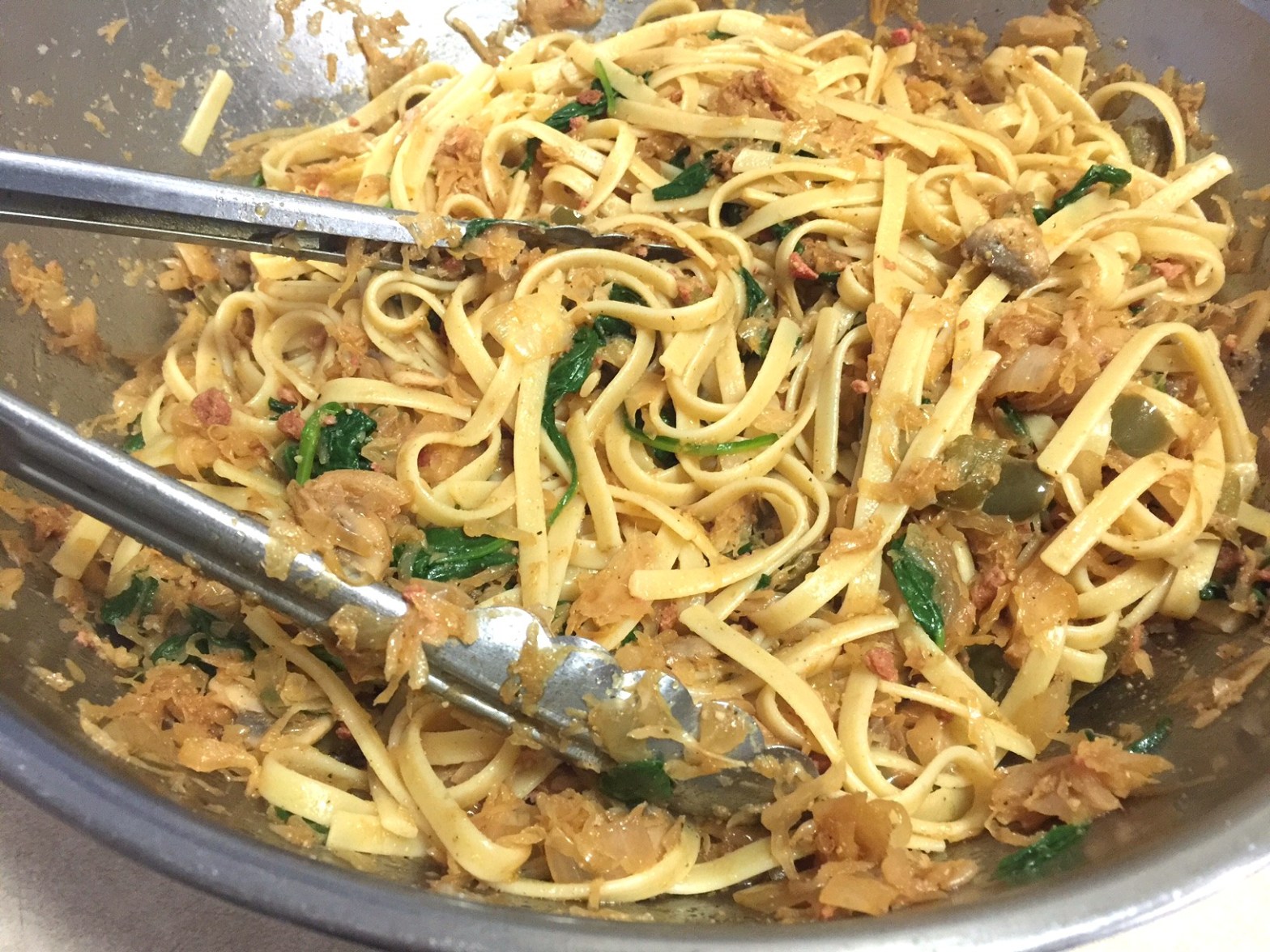 Transfer pasta and spinach to an extra-large bowl. Add the saute mixture. Stir to evenly distribute.