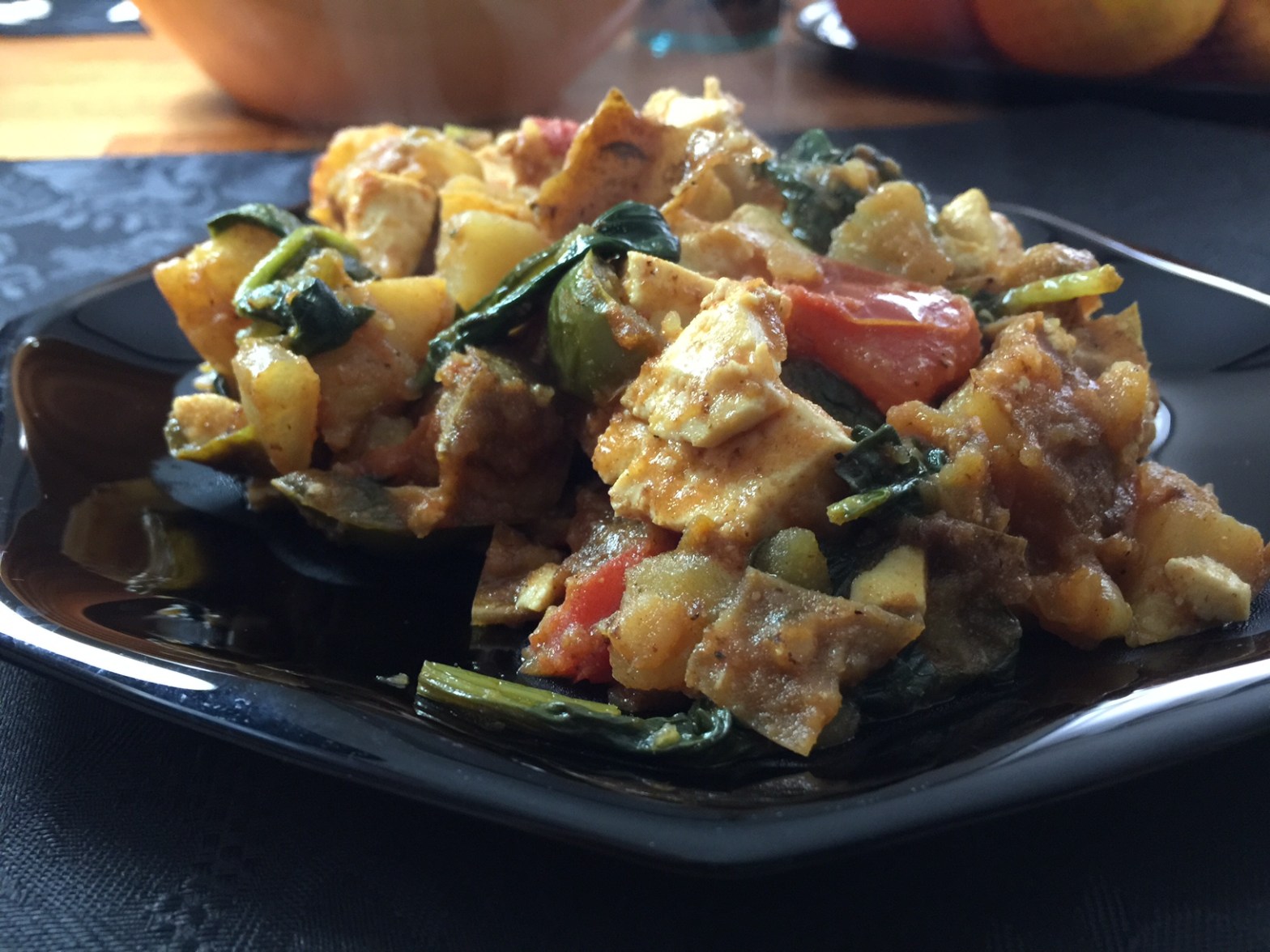 Leftover baked potatoes fried up with onion and peppers. Seasoned with garlic, rosemary, curry and smoked paprika. Red wine vinegar to tame the glycemic spike? Of course. It tastes great, so we’ll do it. Tossed with fresh vine tomatoes, fresh spinach and House Foods tofu! A late morning delight!
