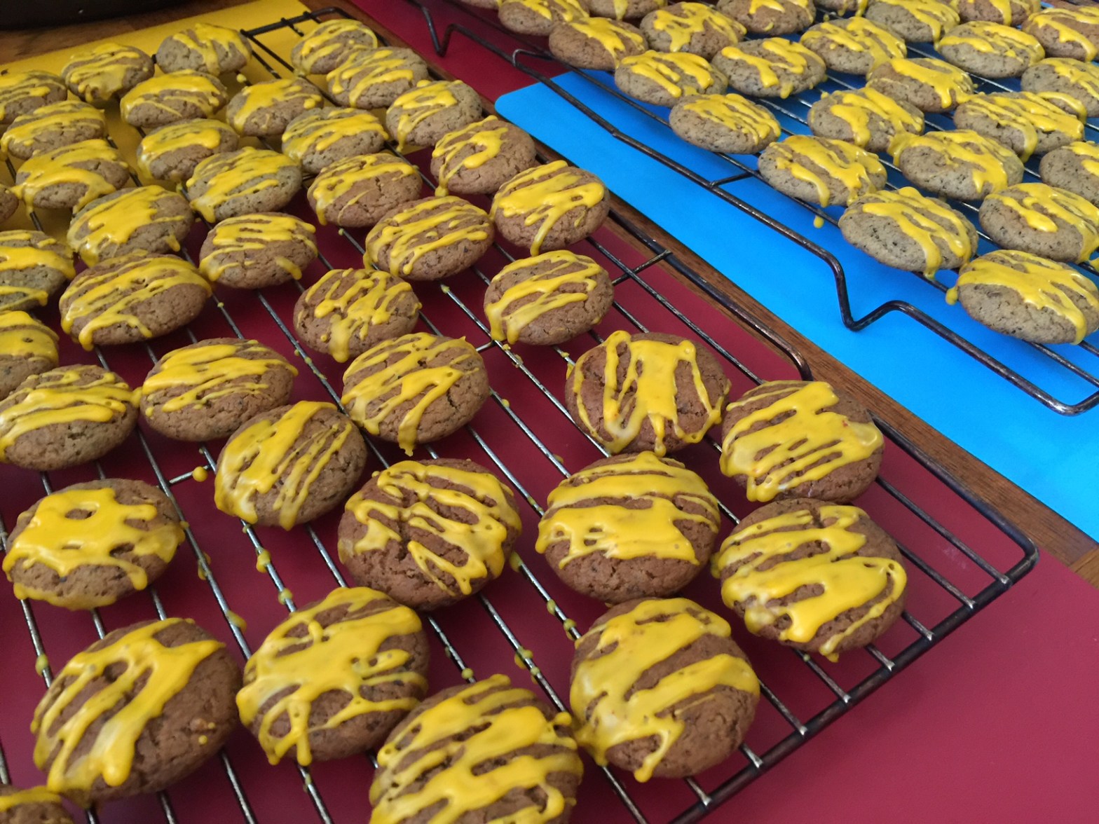 Drizzle icing over tops of cookies in streams, while they are still on wire rack.