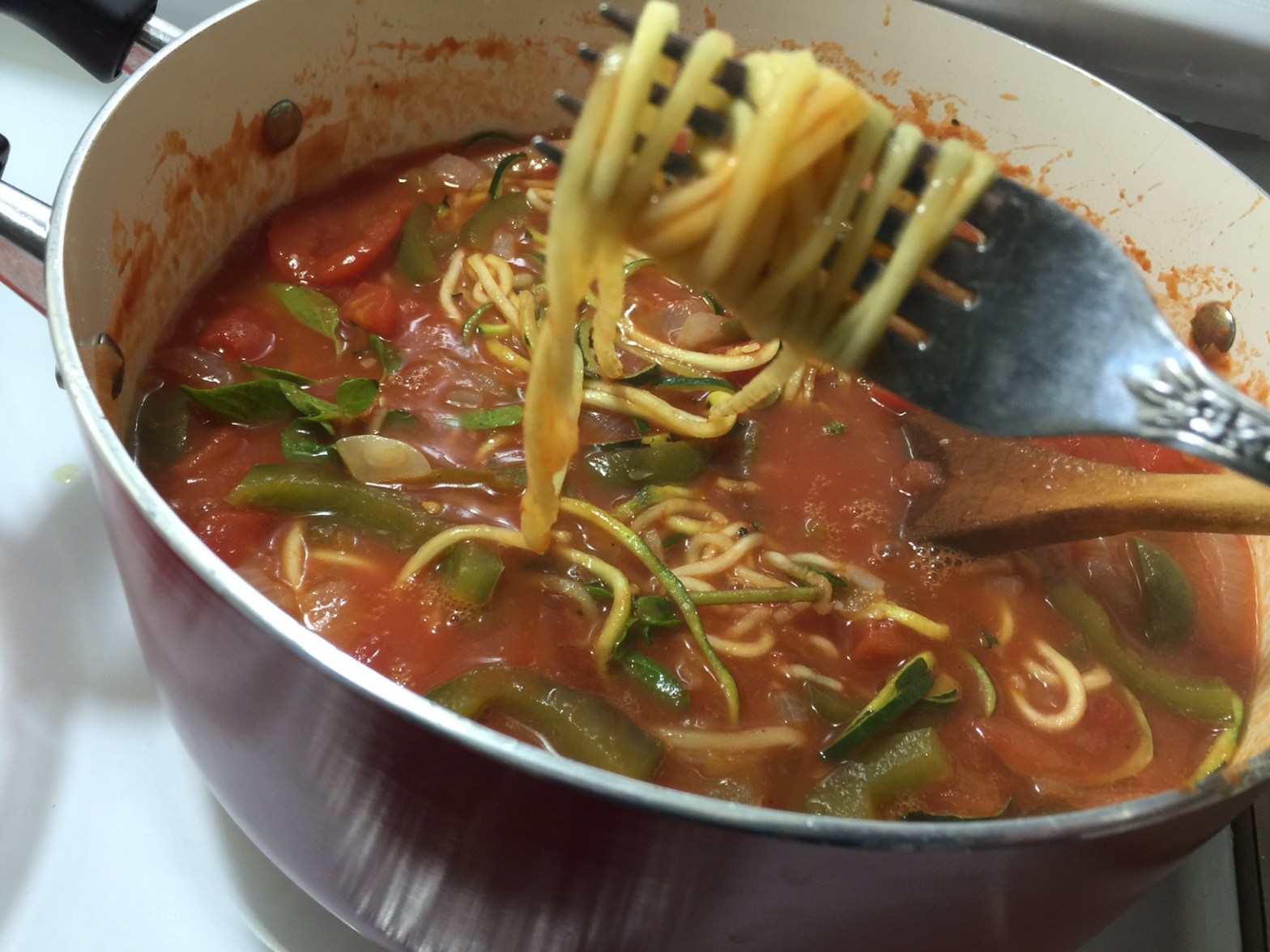 With spiralized zucchini used in place of the pasta! Hot, sweet, timid, lovely, exciting, smooth, bold! A vegetable main dish, soup or stew – no matter what you call it, it’s still wild!