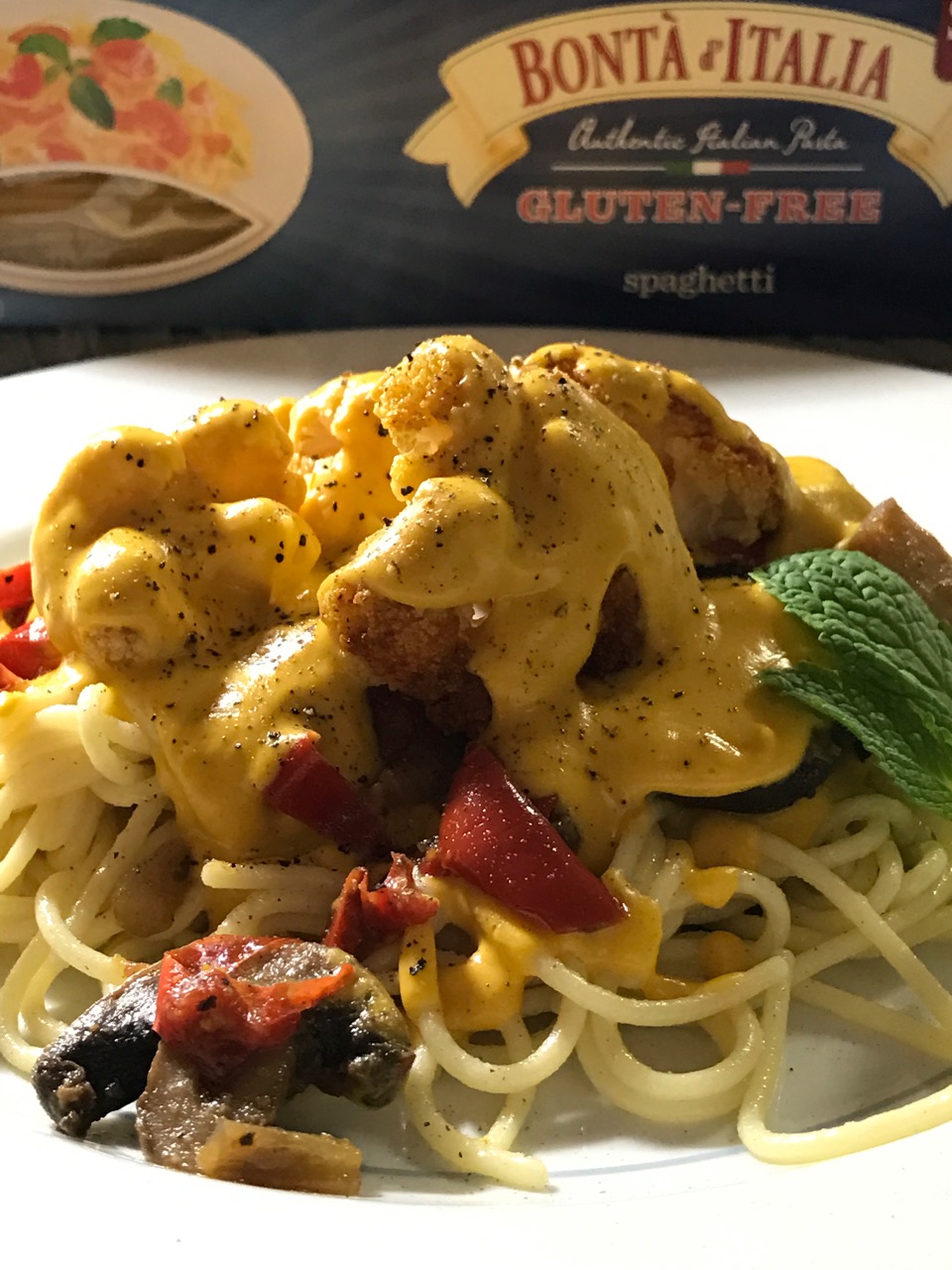 Schar’s Gluten-Free Spaghetti topped with sautéed mushroom, sweet red pepper and onion. Followed by paprika and saffron seasoned roasted cauliflower. Top it all off with a Cashew Paprikash Cheese Sauce. Sprinkled with fresh grind black pepper and served with a fresh mint garnish!