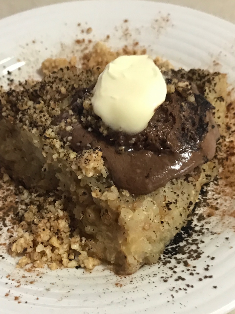 A pearly Toasted Quinoa Breakfast Pie made pearly by the addition of Minute Tapioca. Cooked in almond milk with brown sugar, raisins and vanilla. Served hot in a bowl drizzled with additional almond milk and topped with a smoky mixed nut crumble, a pat of margarine, light brown sugar, then dusted with cinnamon.