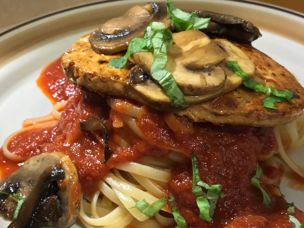 Reheat separately: marinara sauce, mushrooms in skillet, and meat-free chick’n cutlets in the other skillet.
