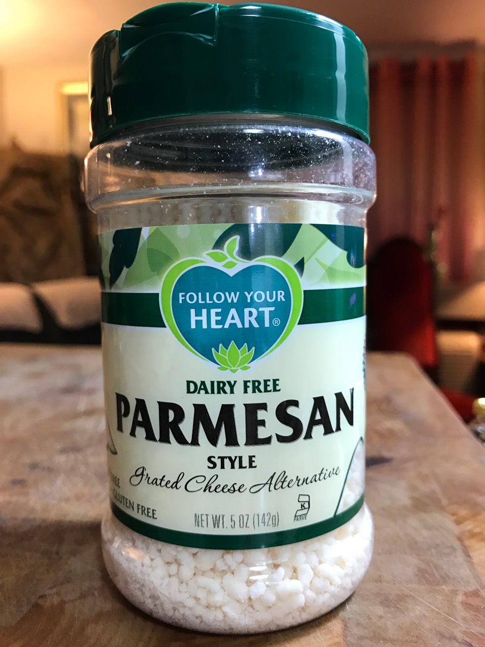 Vegan Parmesan In A Shaker. And yes, it’s made by Follow Your Heart – the same people who make vegan parmesan shreds.