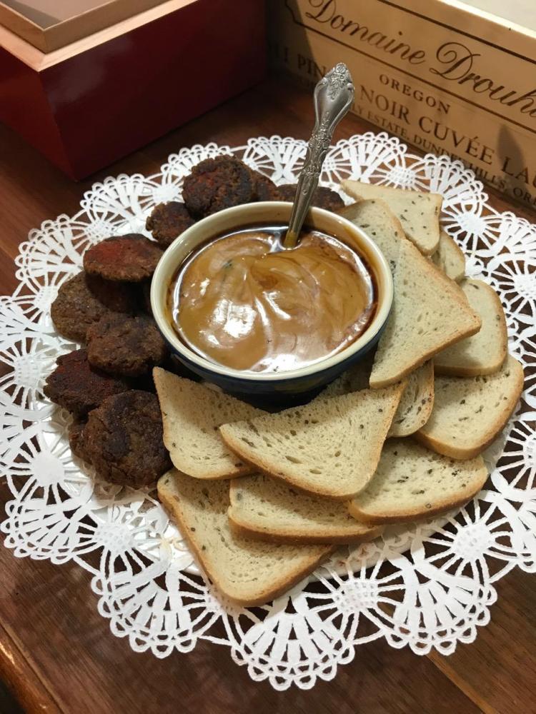 A meaty flavored and textured animal-free pate. This pate served as fried sliders on Jewish rye cocktail bread with mustard, veg mayo and cilantro will have your guests singing at any holiday gathering!
