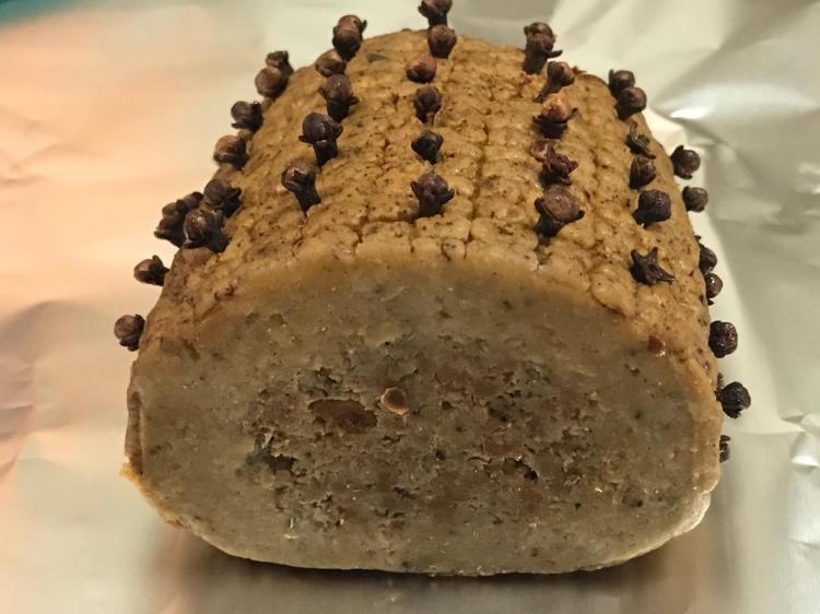 1 lb. Field Roast Celebration Roast – studded with whole cloves – top and sides, about 1/2 inch apart – then wrapped in heavy aluminum foil to completely seal and baked in a preheated 350 degree oven for 1 hour. Remove from oven and remove foil.