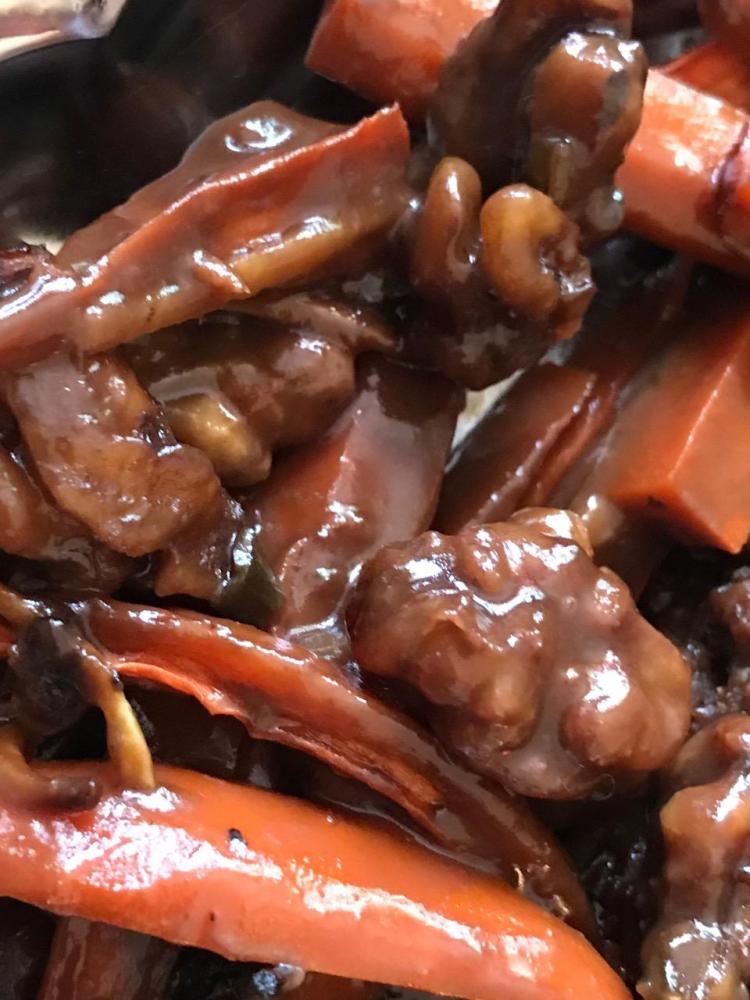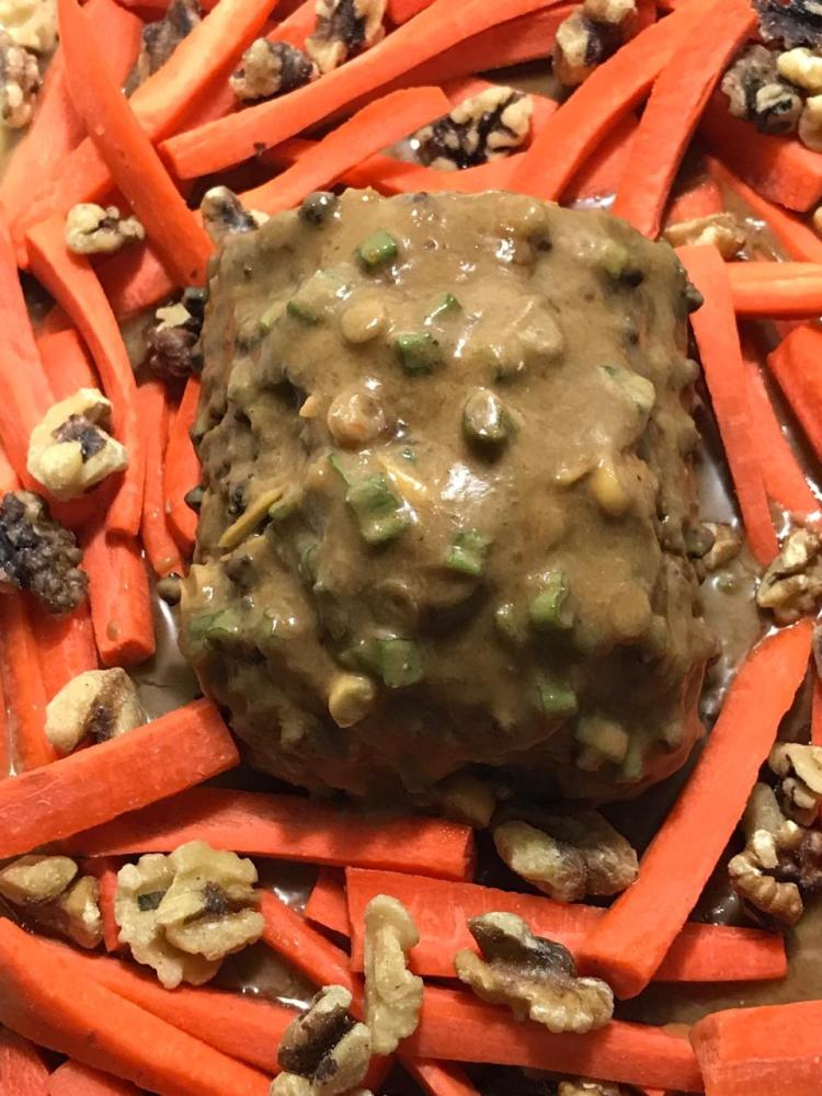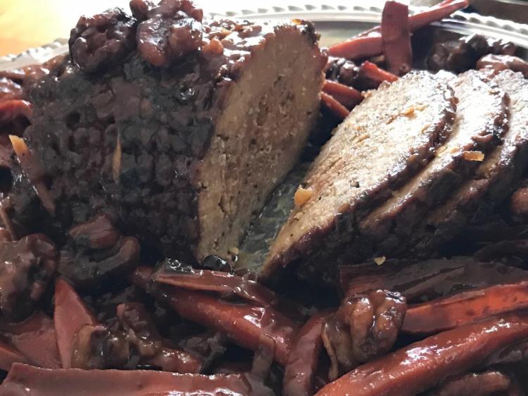 Notes: Well, if you’re going to have a roast, then this is the way to go. What the marinade turned to gravy does to the carrots and walnuts will surprise your palate – can carrots and walnuts actually taste like animal meat? I guess so. The cloves are a smart addition to the roast if you can’t make up your mind whether you want ham or beef for the centerpiece plant meat. Why not both? It works.