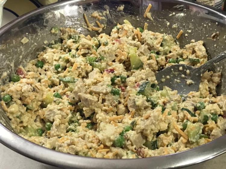 Spoon all of dressing into chicken/veggie bowl. Toss gently to evenly coat all ingredients. Refrigerate for service later or use immediately.