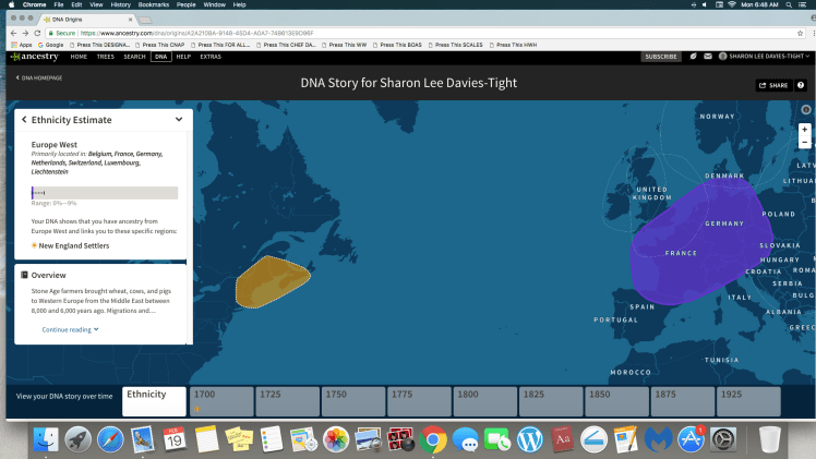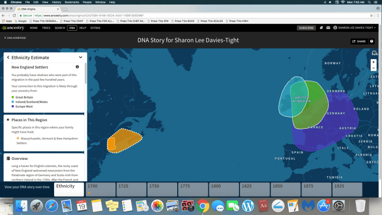 The New England Settlers’ ethnic categories for me included Great Britain, Ireland/Scotland/Wales and Europe West. The Davidson side of my mother’s family are from Inverness, Quebec outside of Montreal, which is included on the map along with New Brunswick, Nova Scotia, Prince Edward Island.