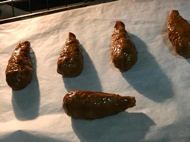 Coated in Sweet Smoky Mustard Sauce and baked till crispy. Garnished with fresh cilantro and served with additional dipping sauce spiked with Balsamic vinegar and a mild sesame seed oil! The texture, flavor and overall mouth-feel is impressive! I would order these out if I had my choice of dipping sauces! I look forward to try more – they’re in the freezer now!! The cilantro is a nice touch!