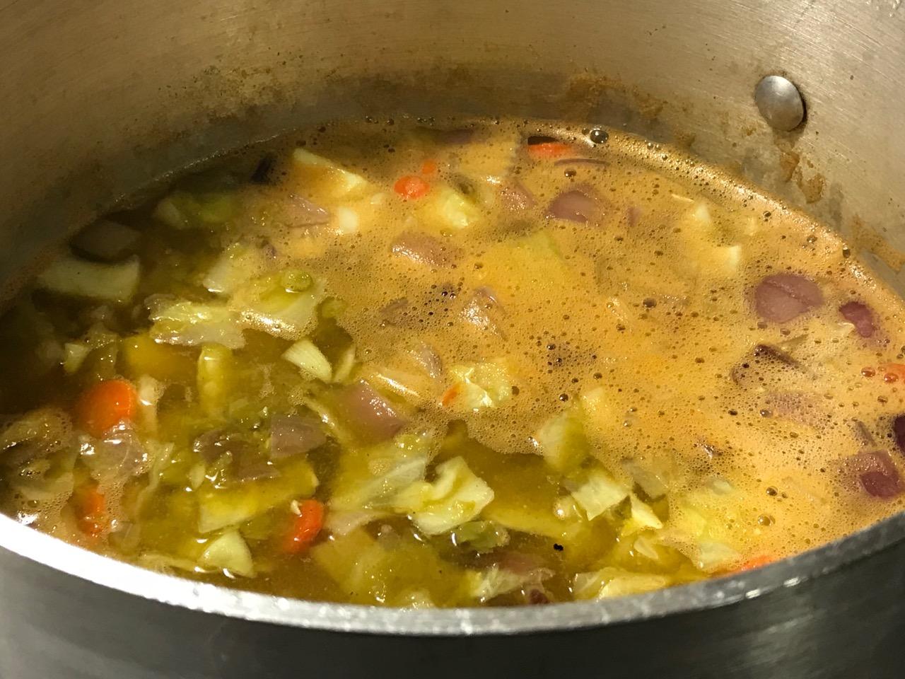 Add carrots, cabbage, onion, salt, pepper, garlic powder, smoked paprika, rosemary, turmeric and vegan yeast. Stir well, bring to boil again. Cover, reduce heat to low and cook 30 minutes longer.