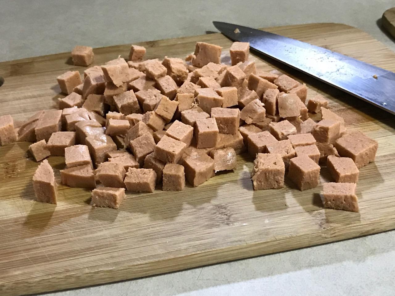 approx. 1/2 lb. thawed May Wah Imitation Vegan Ham, diced into 3/8 inch cubes