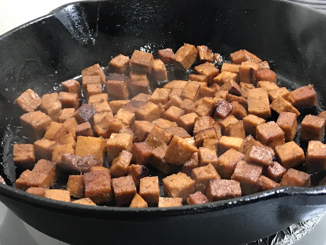 In the meanwhile, place sesame oil, liquid smoke, Balsamic vinegar, salt and pepper in medium skillet. Add diced vegan ham, stir and let set till you’re ready to serve.