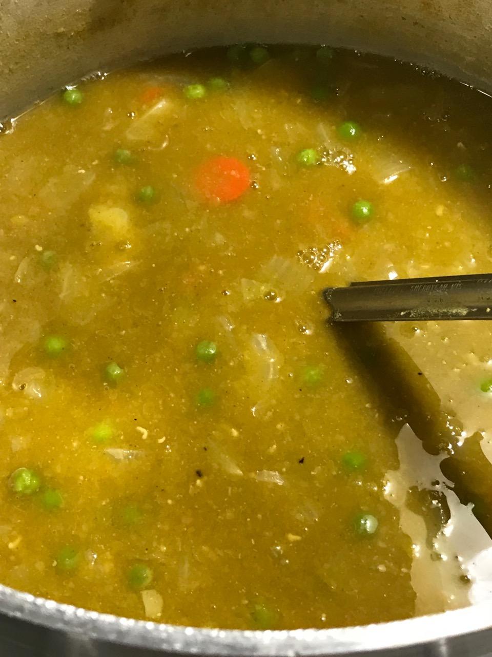 Split peas should be mushy and vegetables super-tender by now, so turn off heat.