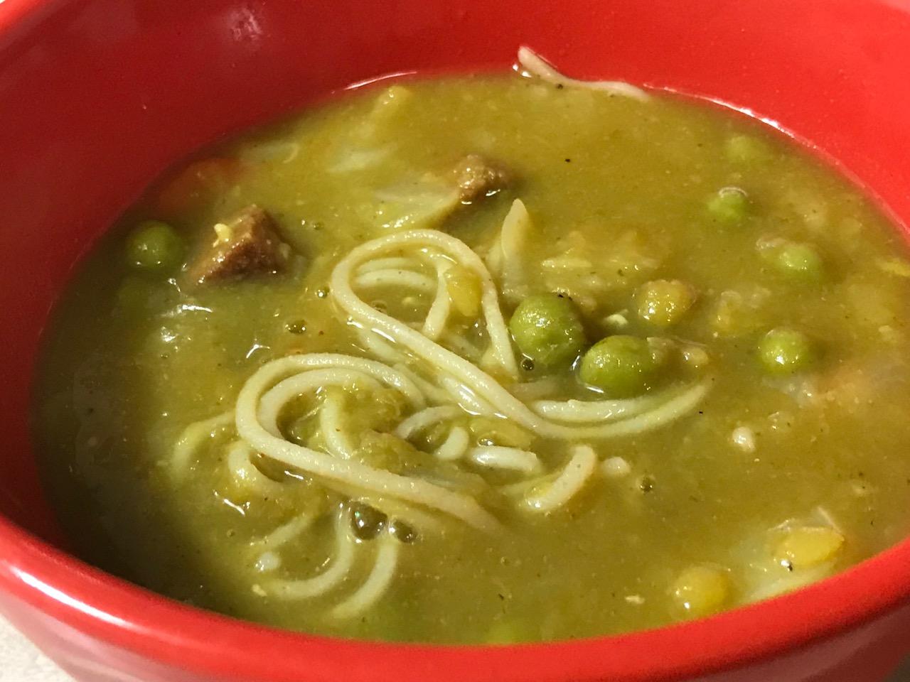 Ever try spaghetti in your pea soup? Make it ahead, then place a bit in the bottom of the soup bowl and spoon soup over all. If you place it in the soup it will become too mushy with the heating and reheating of the soup. This is especially important for restaurant service.