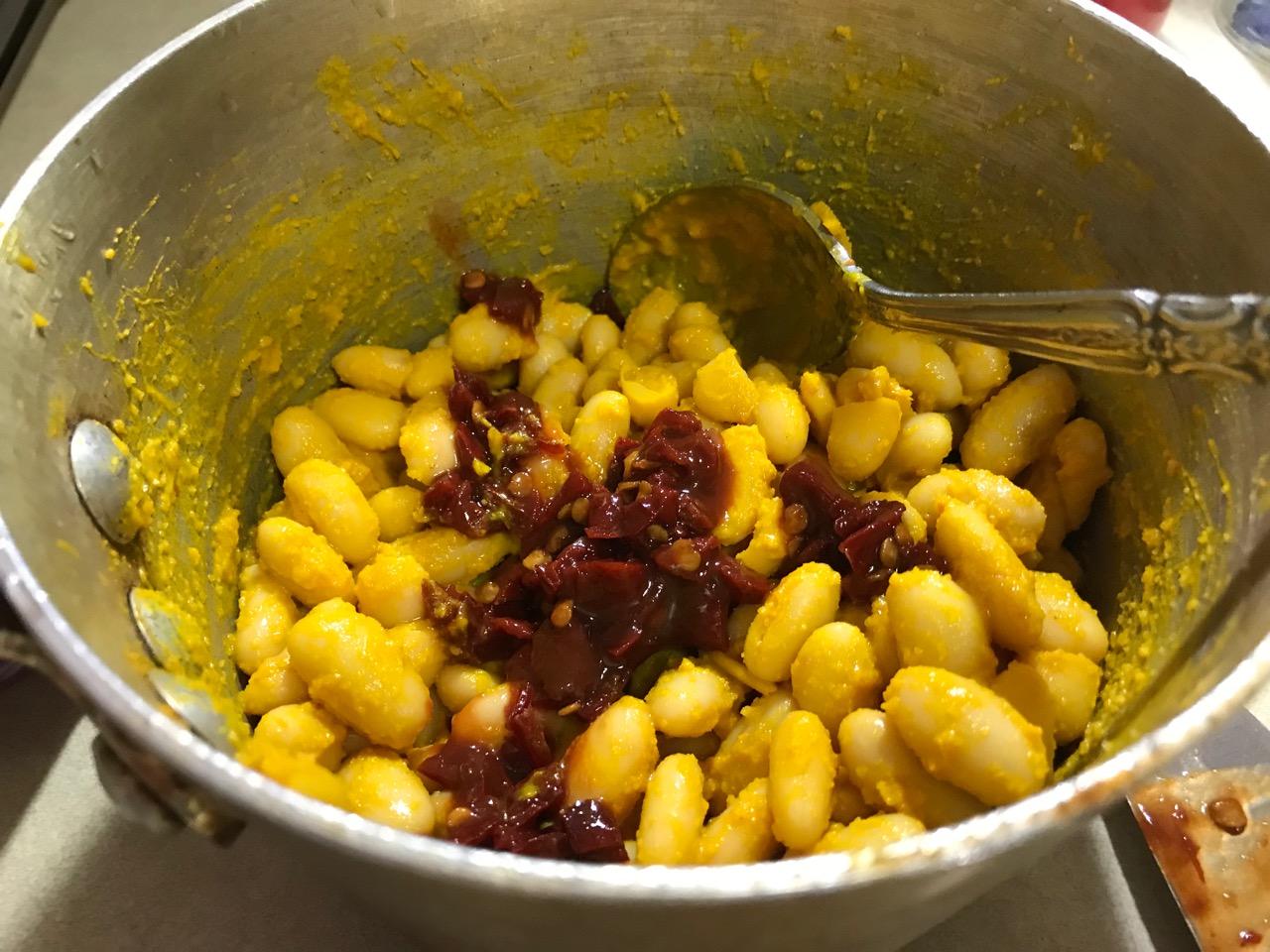 Combine drained beans, garlic, salt, sugar, chopped chipotle peppers in bowl or pan. Stir well and set aside till ready to assemble salad.