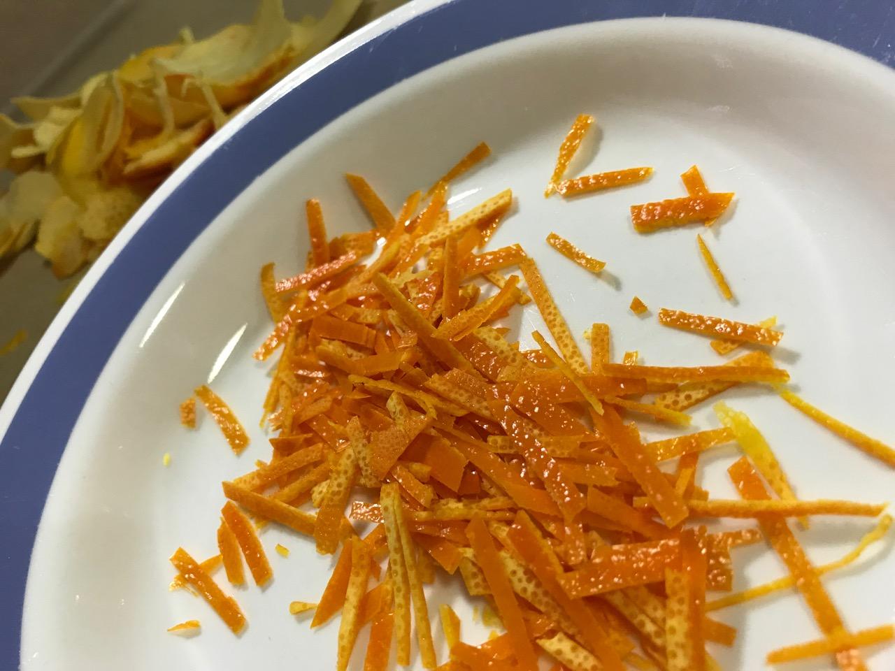 rind of 1 lg. orange cut into matchstick size pieces – wash orange, peel with sharp knife, cut peel into workable segments, 5 or 6, then using broad side of large sharp knife remove pithe (white part) from the orange peel, by laying the peel segment pithe side up flat on board and running knife between pithe and peel while pressing with hand that is not holding the knife, on top of the flat blade of the knife as you slide the knife between the two surfaces; clean each segment up by removing white spots that remain, then stack and cut into matchsticks