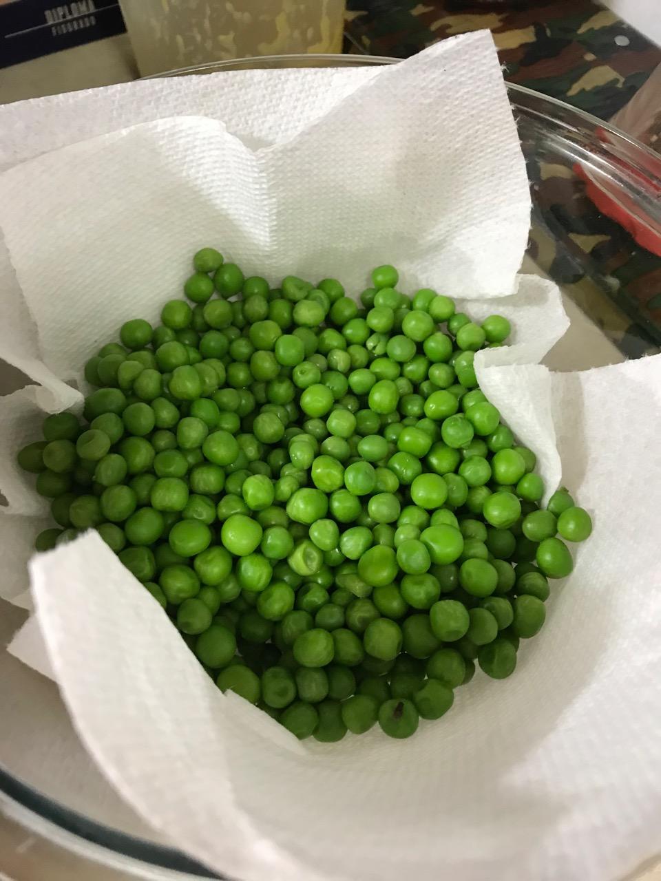 2 c. froz. peas, blanched till thawed and plump, then drained in wire mesh strainer, cooled under faucet water, then let set in strainer over bowl to dry while you prepare other ingredients