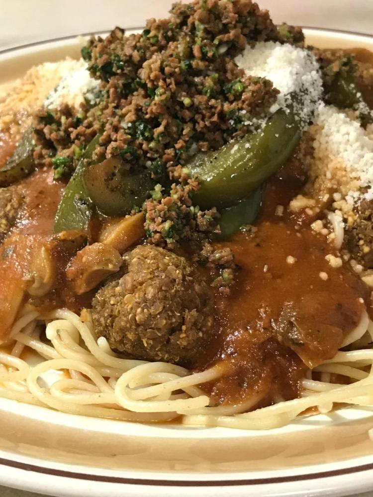 You can use any plant deli slices – even hot dog – but the firm texture of the [Canadian] bacon lends itself well to the design of the crumble. We want chewy. Next time I’ll try half [Canadian] bacon and half hot dog just to experiment.