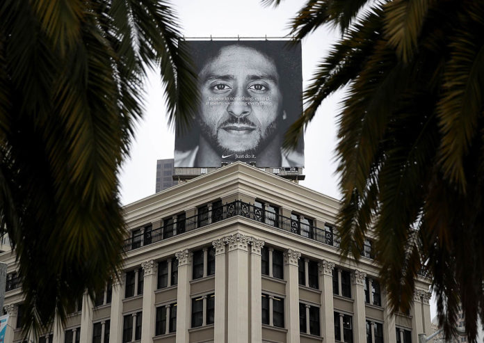 SAN FRANCISCO, CA – SEPTEMBER 05: A billboard featuring former San Francisco 49ers quaterback Colin Kaepernick is displayed on the roof of the Nike Store on September 5, 2018 in San Francisco, California. Nike launched an ad campaign to commemorate the 30th anniversary of its iconic “Just Do It’ motto that features controversial former NFL quarterback Colin Kaepernick and a message that says “Believe in something. Even if it means sacrificing everything.” Justin Sullivan/Getty Images/AFP == FOR NEWSPAPERS, INTERNET, TELCOS & TELEVISION USE ONLY ==