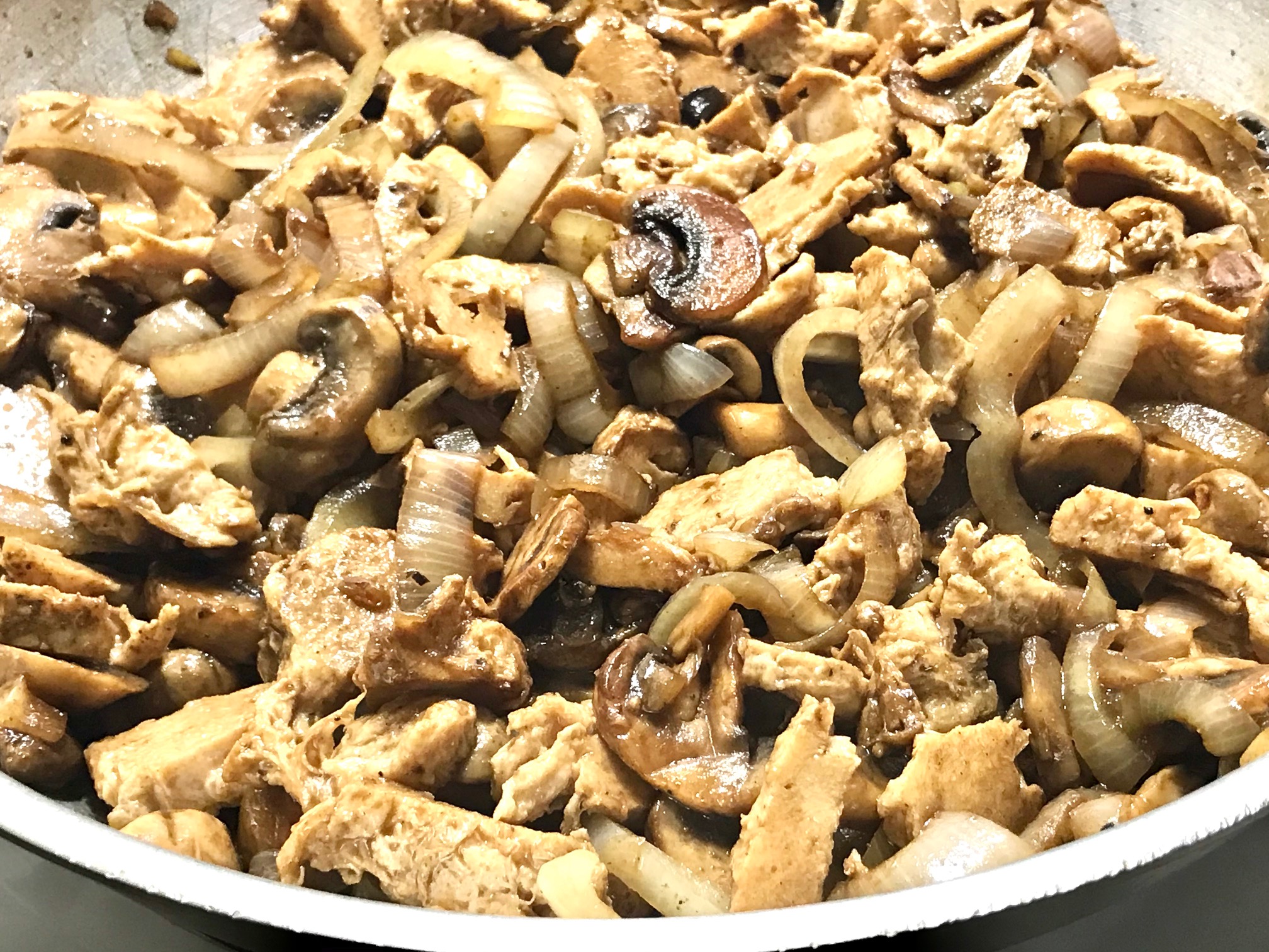 Add soy chicken strips, salt, black pepper and poultry seasoning. Stir to disperse, then saute till heated through.