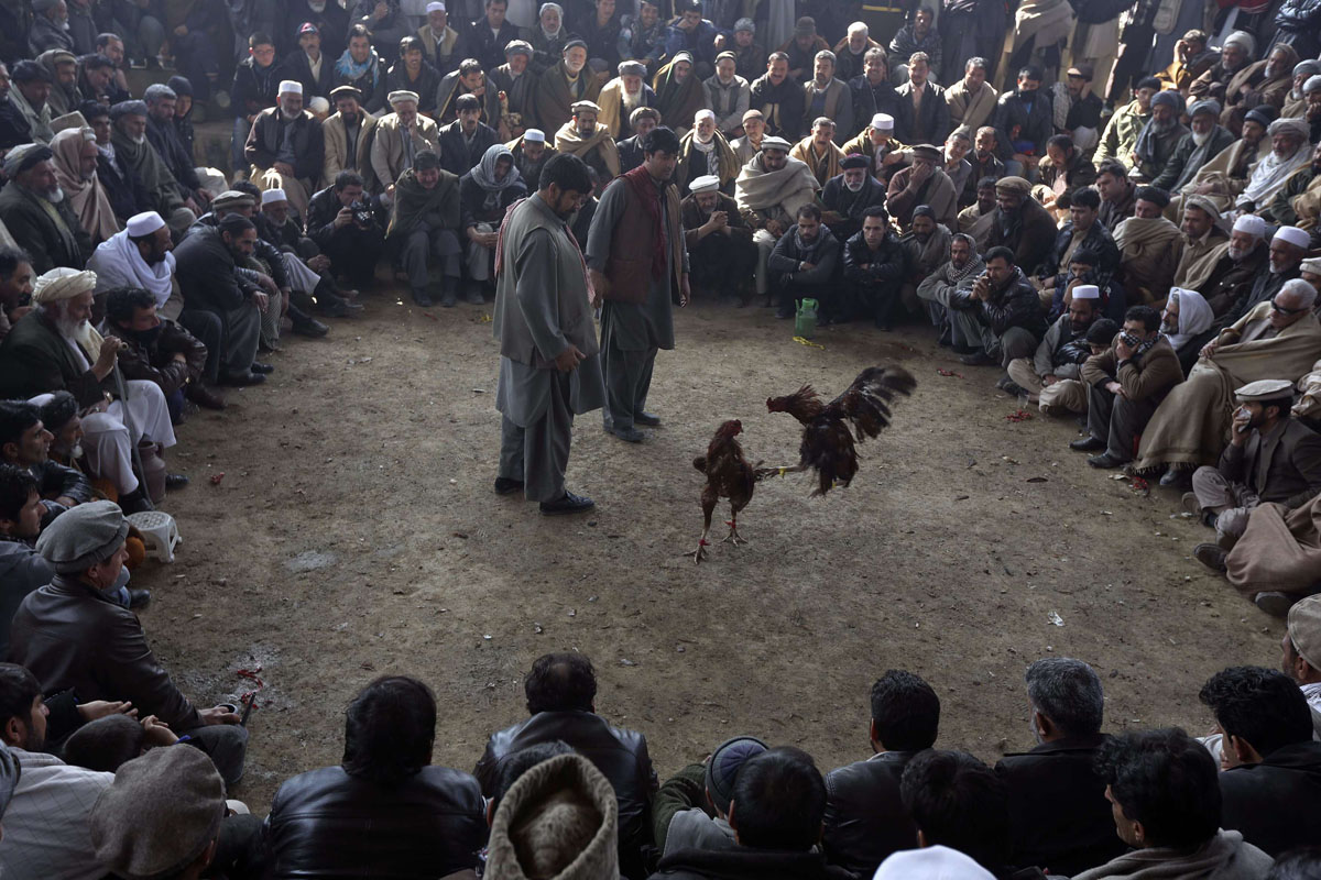 Afghan men watch as roosters fight during a traditional cockfighting competition in Kabul