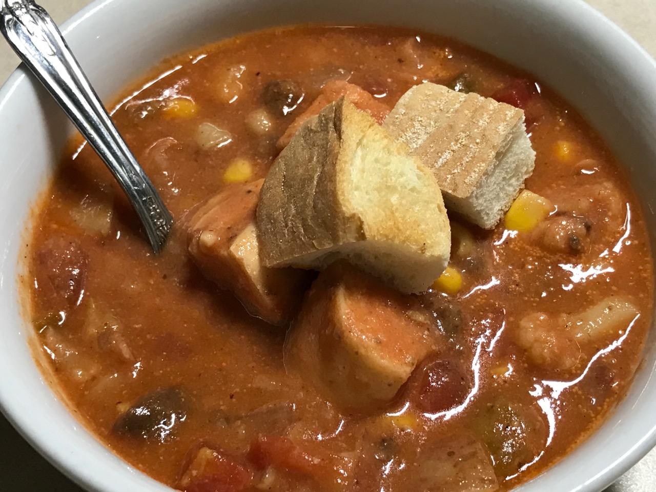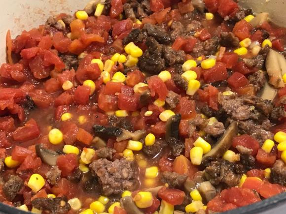 4 – To the extra-large soup pot add: tomatoes, paste, corn and mushrooms, stirring well, being especially cognizant of smoothing the paste evenly into the pot.