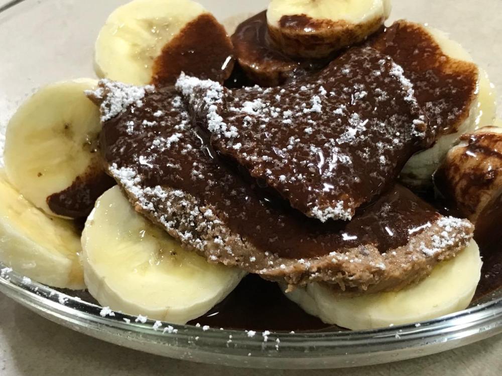 Spoon a couple tablespoons of fresh ground chocolate peanut butter (also sold at Lucky’s market) over the bananas.