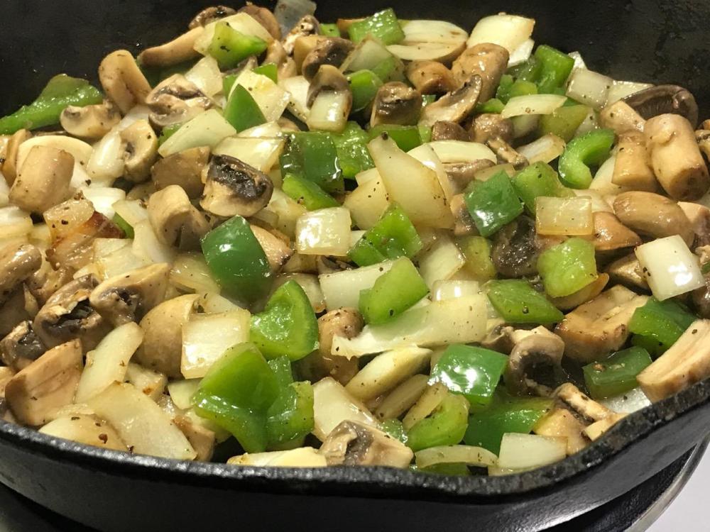 Add green pepper, onion and mushroom. Saute till onion becomes translucent, stirring as often as needed to achieve an even cook.