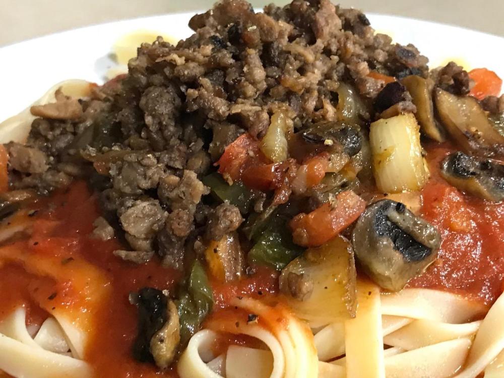 DELALLO Roasted Garlic Sauce with Chardonnay wine and V-8 juice used as extenders. Served with a mushroom, pepper, onion and tomato saute. Served over fettucini and topped with a BEYOND and LIGHTLIFE beef and sausage crumble!