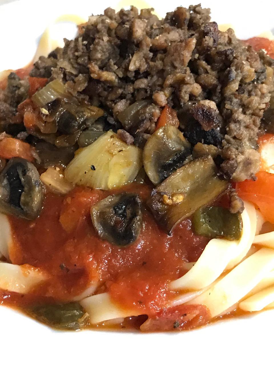 DELALLO Roasted Garlic Sauce with Chardonnay wine and V-8 juice used as extenders. Served with a mushroom, pepper, onion and tomato saute. Served over fettucini and topped with a BEYOND and LIGHTLIFE beef and sausage crumble!