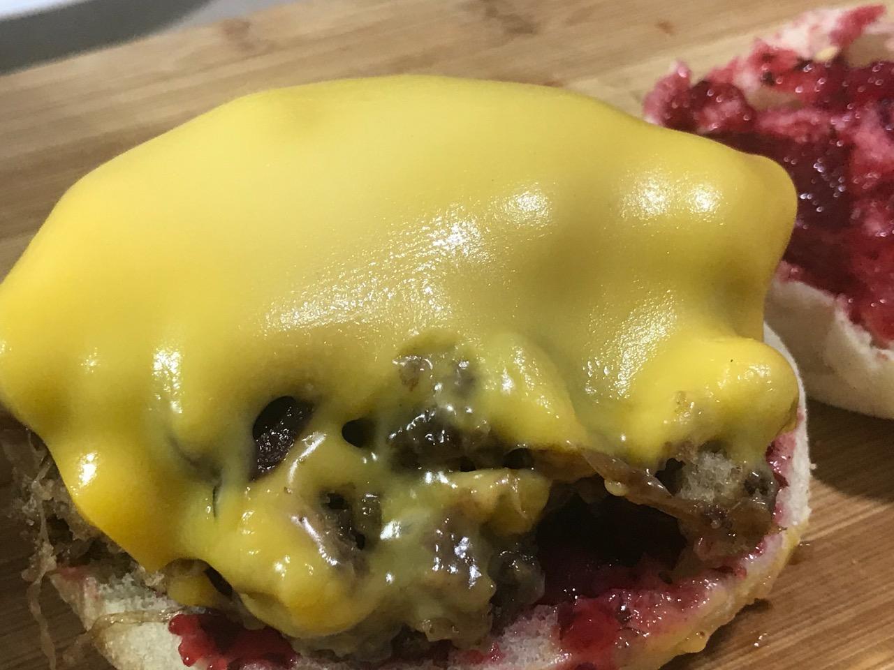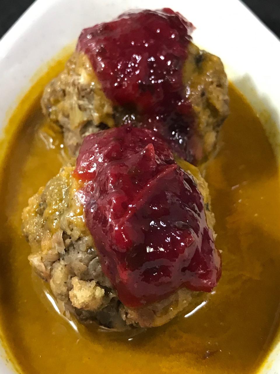Then lightly toast an English Muffin, spread with cranberry sauce and mustard, then using a pancake turner slip the stuffing and cheese onto the muffin in one piece. Close and eat. Wow.