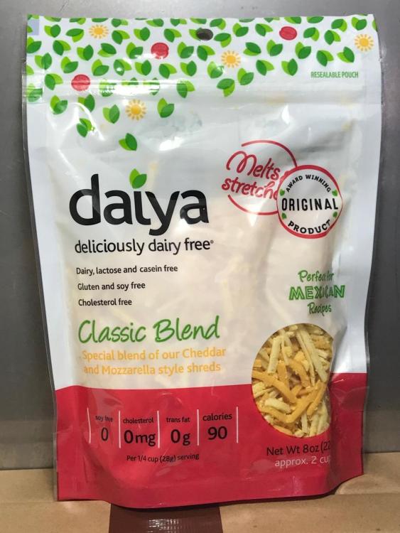 8 oz. pkg. Daiya dairy free Classic Blend Cheddar and Mozzarella style – shreds – at room temperature