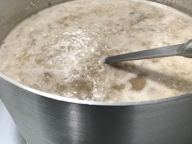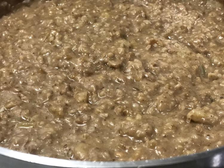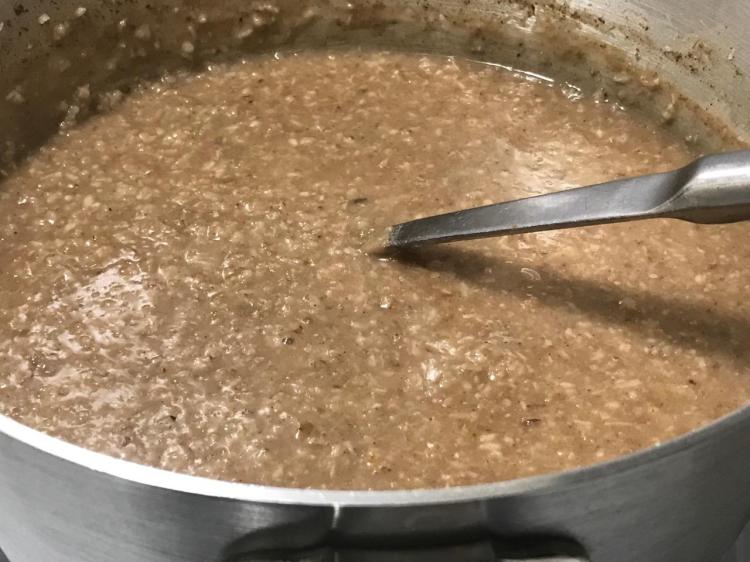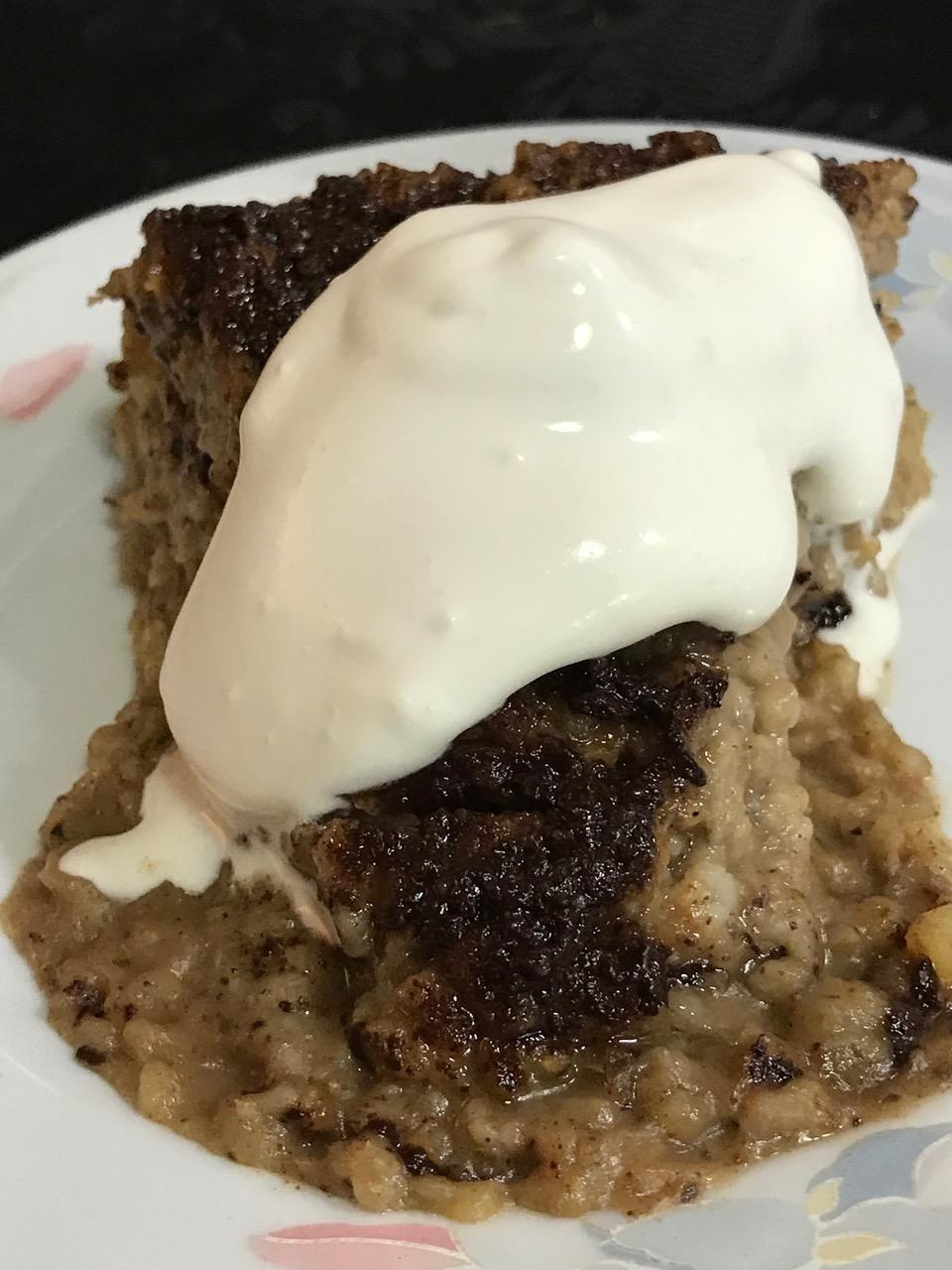 This is some kinda’ Scottish Pie. Okay, serve it right out of the pan, hot with a dollop of full fat coconut milk solids salt and peppered. Yes, salt and pepper on this meaty, chewy, porky type oatmeal. The Scots are rolling on the floor and rising from their graves. Sharon did it! I’ll be trying some vegan whipped cream on this Scottish breakfast delight quite soon! Serve hot or cold, depending on the weather and your appetite!