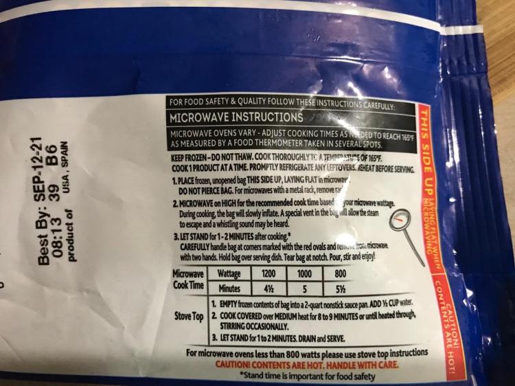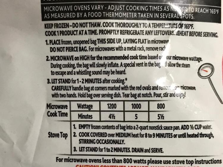 This was not going to be easy. Okay, so I don’t pierce the bag. I lay the frozen bag flat and even on the carousel. I look for the timing and it gets tricky. I have to know the wattage of my microwave. Are you kidding? I go over and start looking on the top, the sides, the inside and find nothing. So if wattage is so important, then why don’t the manufacturers put it where a person can see it?