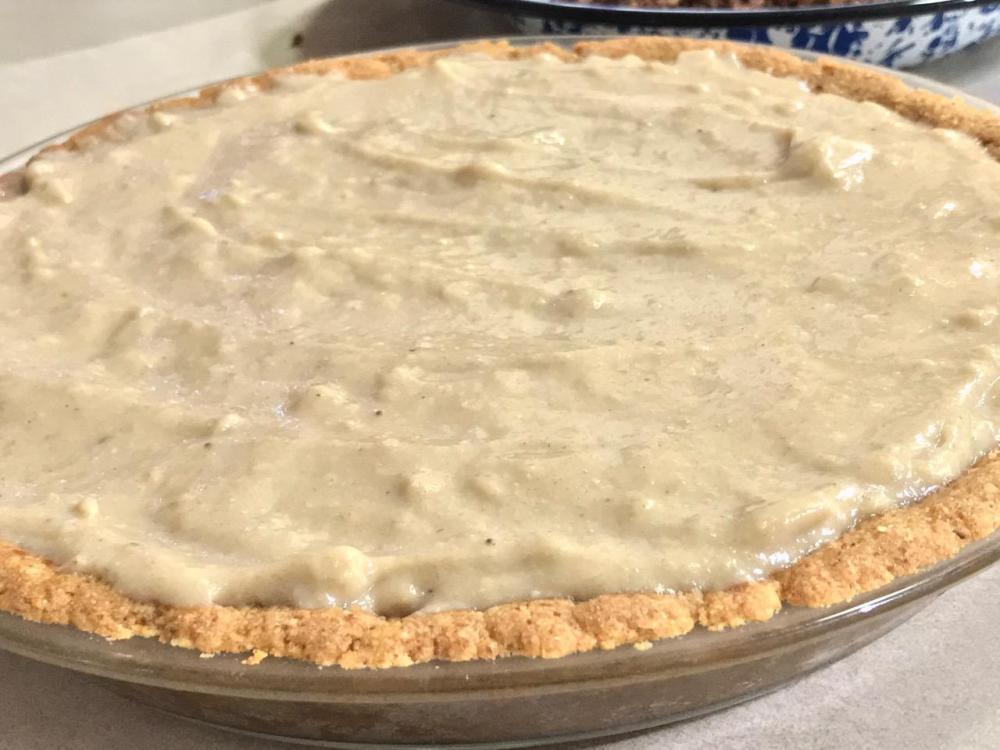 Re-stir filling. If any skin formed on top, when whip with beaters or whisk. This pudding is forgiving because of the bananas. If there are small lumps people with assume they are flavored banana bits. Remember, rough and tumble cream pie. You don’t want to put the cream pudding into the crust hot, nor cooled pudding into a hot crust. Finesse it.