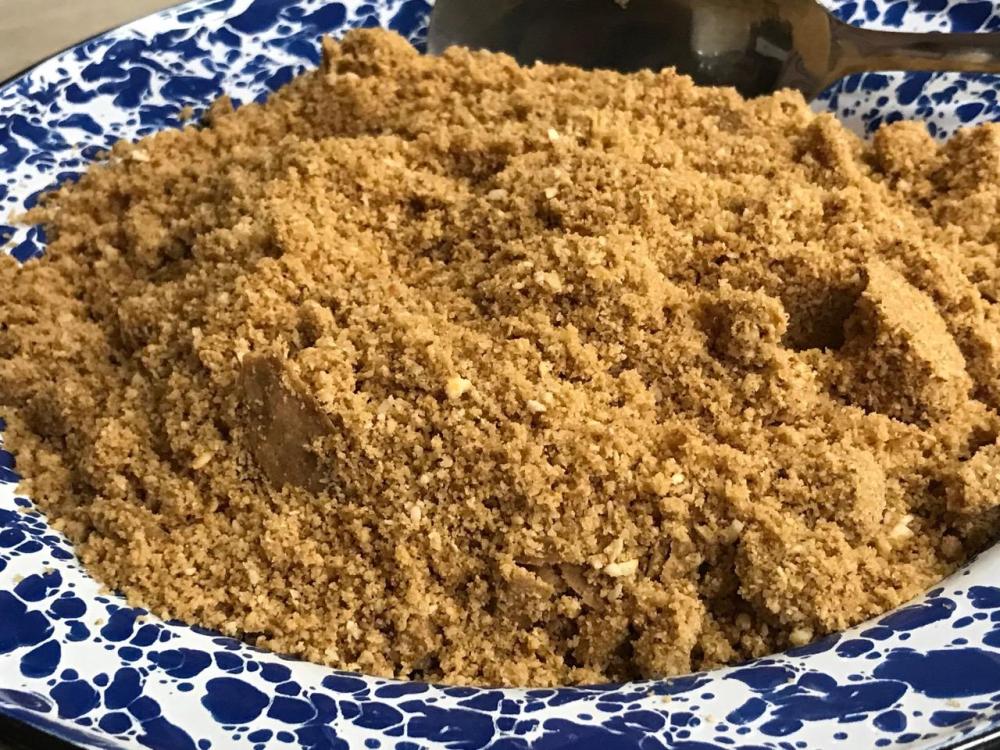 Do not mash the sugar into the crumbs – lightly coat till the sugar adheres to the crumbs, not till the crumbs devour it. You don’t want the sugar to melt into the crumbs.
