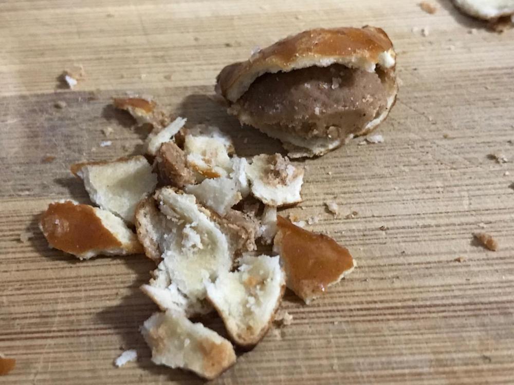 As you can see by the photos I took the time to cut a couple nuggets open to view and taste the peanut filling. The filling is hard, which explains why I didn’t know it was there. It matched too closely to the pretzel in texture. There appeared to be enough of it, just not enough contrast between the filling and the pretzel to notice it much.