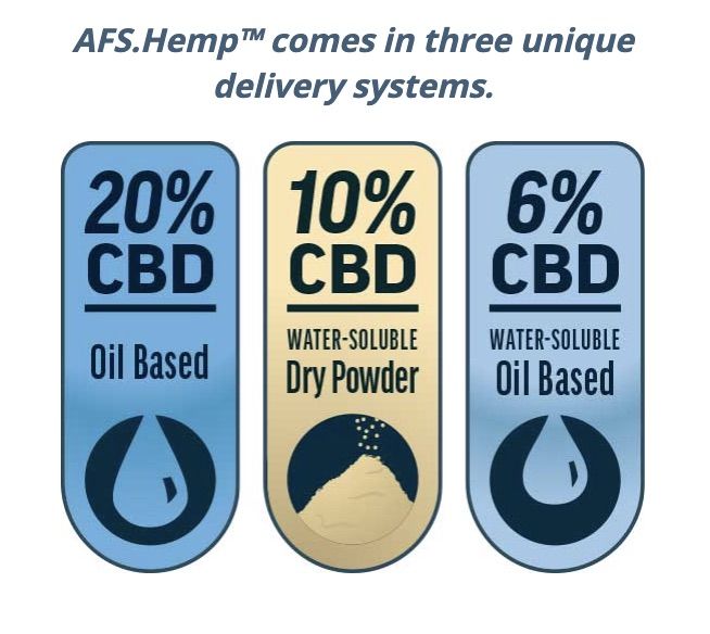 AFS.Hemp™ comes in three unique delivery systems all standardized to CBD content. While the cost per serving of active CBD is the same across all three products, each ingredient has its own advantages for any desired formulation.