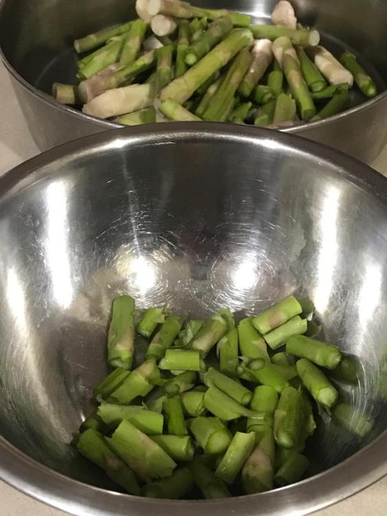 1 lb. fresh asparagus – wash, bend each stalk to snap off bottom 3rd (save the bottoms for later), boil in water with 1 t. baking soda till soft, drain and set aside