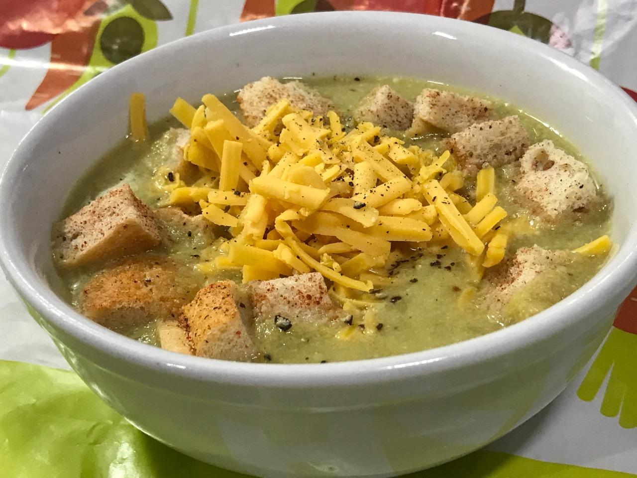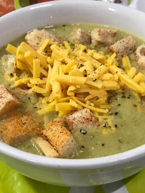 Add a few small croutons and top with shredded Daiya MEDIUM CHEDDAR cheese to uptick the soup to a meal! Yesss! The soup melts the cheese in the bowl.